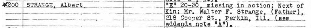 At some point in the early 1930s, the Strange parents split up and remarried (to Rova and Mills Meredith, respectively). Walter, Rova, and Albert left Mammoth Cave for Pekin, Illinois, and settled at 218 Cooper Street sometime prior to 1935. Albert finished grammar school in Pekin and spent two years at vocational school focusing on mechanical studies – wood and metal fabrication, machine shop, and drawing. He left school in 1942 to join his father loading railroad cars at the Corn Products Refining Company. In his spare time, he played sports – especially football – and enjoyed hunting with his rifle and shotgun.