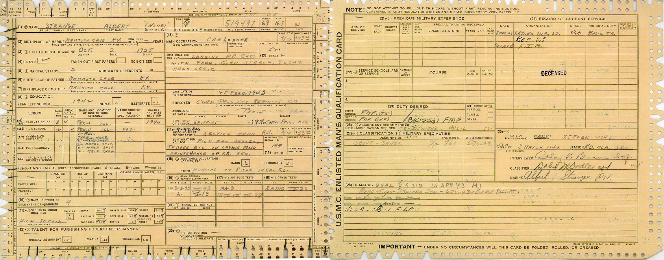 Albert volunteered for Marine Corps service on 25 February 1943. From Chicago, he was sent to San Diego for boot camp; although barely eighteen years old, he impressed his drill instructors during the rigorous training. Private Strange hoped to put his mechanical interests to use as a tanker, but when he shot 310 on the rifle range – an expert rating – he was chosen for extra training as a scout/sniper.