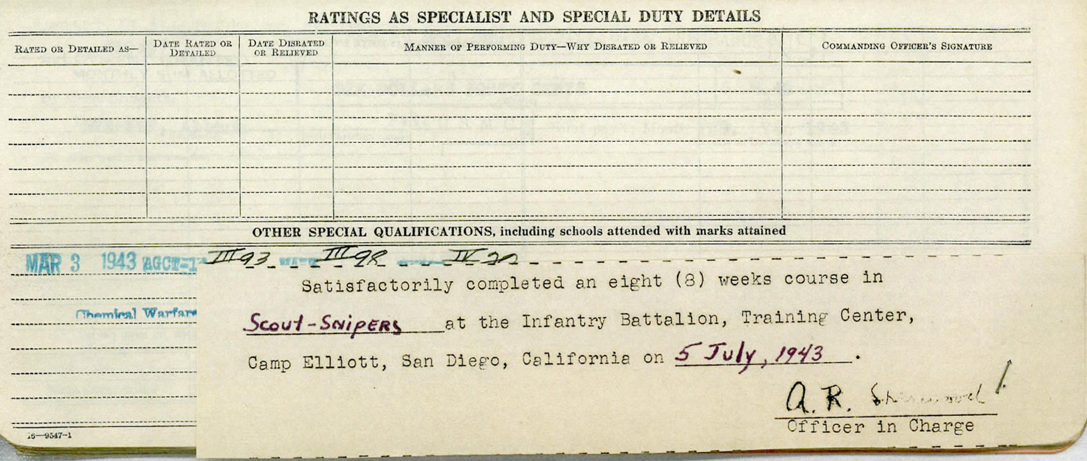 Over the next several weeks at Green’s Farm, a remote training facility at Camp Elliott, Private Strange honed his skills in the field. In addition to marksmanship tips from some of the top shooters in the Corps, the trainees learned “the technique of scouting and sniping… self-reliance and combat initiative [and] the knack of jungle fighting.” The basic course ran five weeks; the top performers were given an additional three weeks with a Raider training unit at Camp Pendleton. Strange was evidently one of these; his service record book notes that he “satisfactorily completed” the eight-week course in July 1943 and received a promotion to Private First Class.