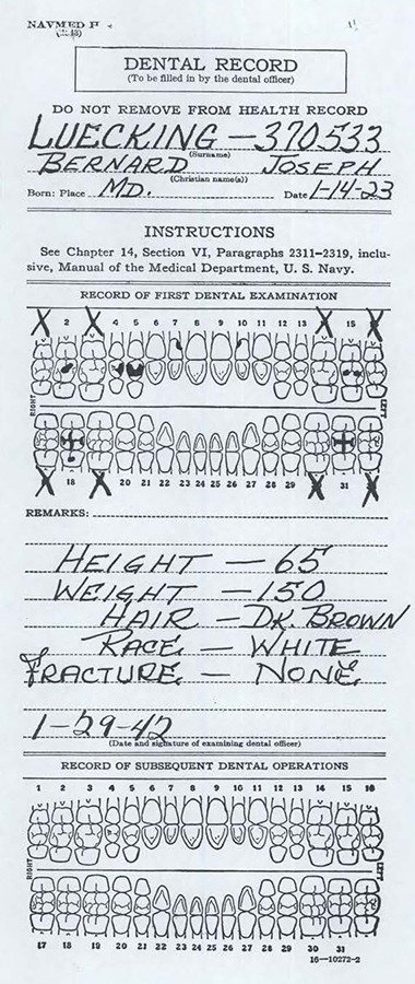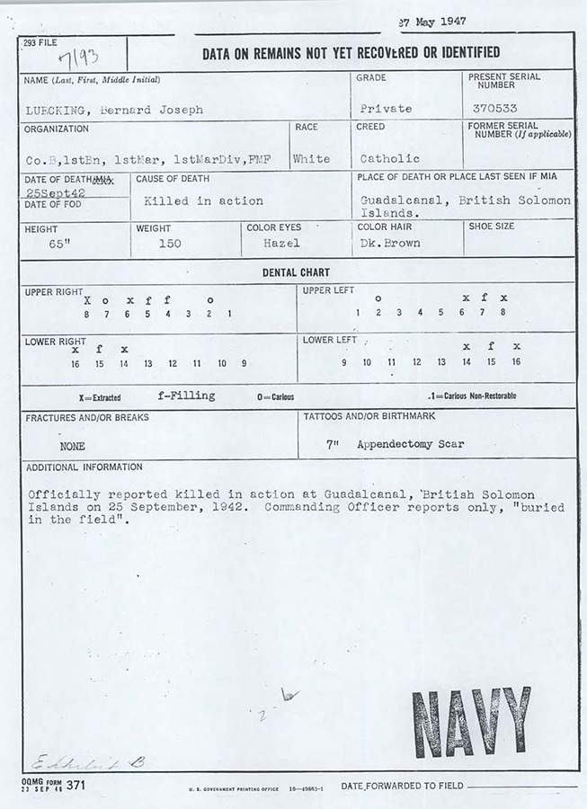 In October 1944, the ambush site was re-discovered by chance. Graves Registration personnel were dispatched and recovered the remains of nine men – eight of them readily identifiable. (The ninth was identified after the war as Corpsman James F. Pierce.) The other nine Marines – including Private Luecking – were not located.