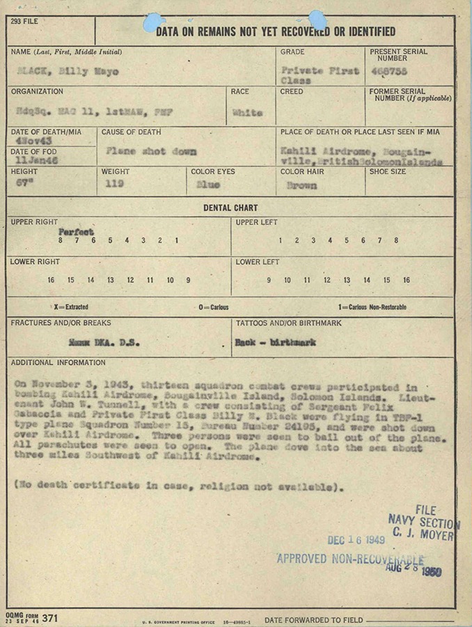 Billy Mayo Black is my great-uncle. Though he perished before my father was born, we have always known him and missed him. We still hold onto hope that his remains will be returned to us.