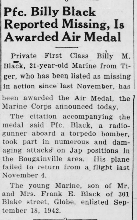 PFC Billy M. Black was a Marine aviator who flew with VMTB-143 during the Solomon Islands campaign.