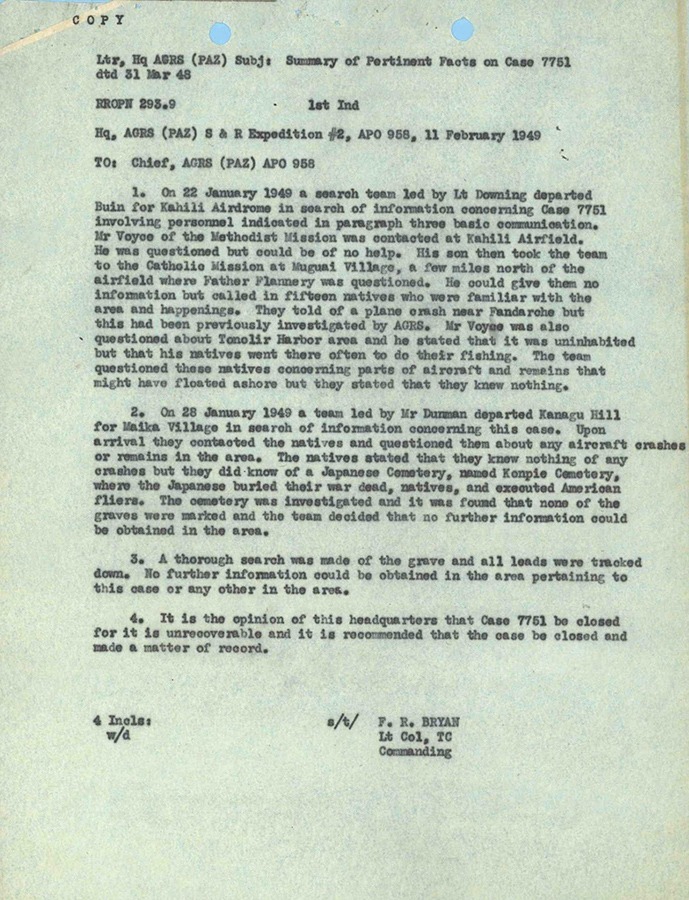 Tunnell, Gabaccia, and Black were reported as missing in action and carried as such until the war ended. Repeated searches failed to uncover any clues as to their ultimate fates, and they were declared dead on 11 January 1946.