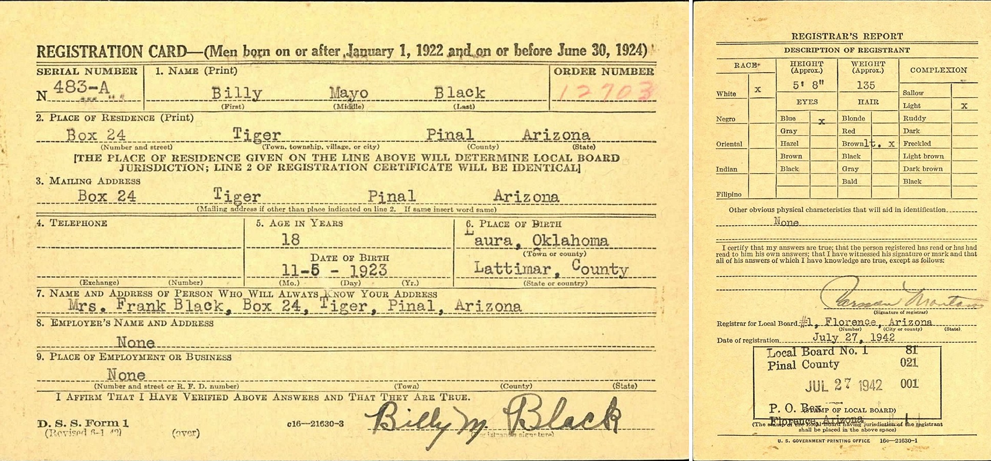 Billy Black was born on 5 November 1923 and spent his infancy in Laura, Oklahoma. In the late 1920s, the Black family – parents Frank and Lettie, plus Billy’s older siblings John, Frank Junior, Orville, and Rosemary – relocated to Arizona. Frank Senior worked in the Gila County copper mines while the children went to school. In the late 1930s, Frank was promoted to shift boss in a lead mine, and the family relocated to Tiger, a remote mining community in Pinal County. Some of the boys followed their father into the business, and Billy may have ventured underground himself. In July 1942, when he registered for Selective Service, he was listed as “unemployed.”