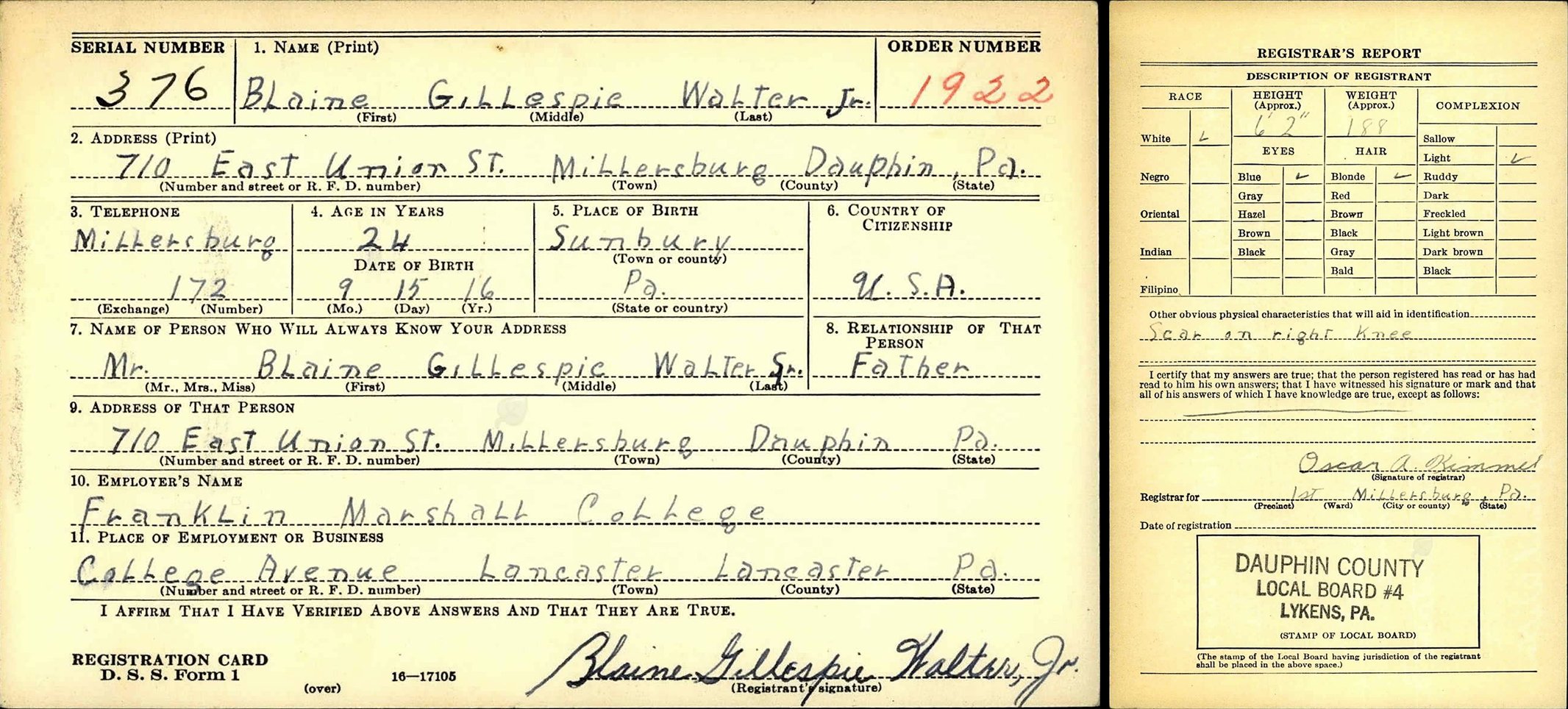 Since Blaine Gillespie Walter, Jr. was born 15 September 1916 in Sunbury, Northumberland, Pennsylvania, and he died 13 August 1942 along the Matanikau River in Guadalcanal, Solomon Islands, he would have been 25 years, 10 months, and 29 days old when he died, not 17 years old as suggested in this article.