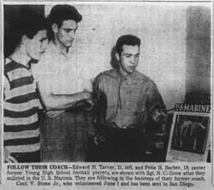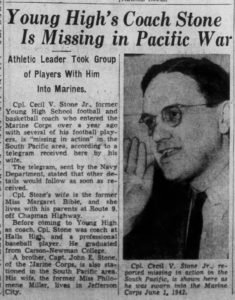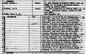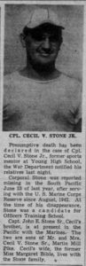 | CIRCUMSTANCES OF LOSS Corporal Cecil V. Stone, Jr., was an artilleryman stationed with a coastal defense battery of the 10th Defense Battalion during the campaigns for the Solomon Islands. After demonstrating his leadership skills on Tulagi and Banika, Corporal Stone was selected for Officer Candidate School. In June of 1943, he received orders to report to Camp Elliott, California by the first available naval transport. Stone happily packed his bags and departed from Banika on 18 June; four days later, he boarded the USS Aludra (AK-72) for the next leg of his journey. At 0444 on 23 June, Aludra was torpedoed by the Japanese submarine Ro-103. The explosion blew the ship’s forward hatch cover and cargo booms overboard. This hatch cover was a popular sleeping spot for enlisted passengers and crew; a report later noted that most of the casualties of the attack were those camped out on or near the forward hatch. Aludra sank at 0933 hours. Among those missing was Corporal Cecil Stone. He was declared dead on 24 June 1944, and the exact cause of his death in the sinking remains unknown. |