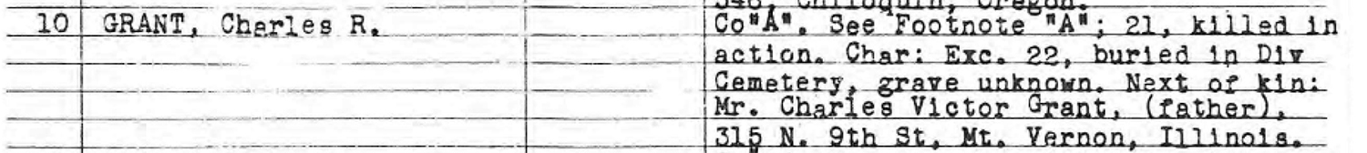 Eighteen-year-old PFC Grant was one of those who fell in action on 21 November 1943, either during the landing itself or shortly after coming ashore. His death was confirmed by company officers, but no specifics were recorded.