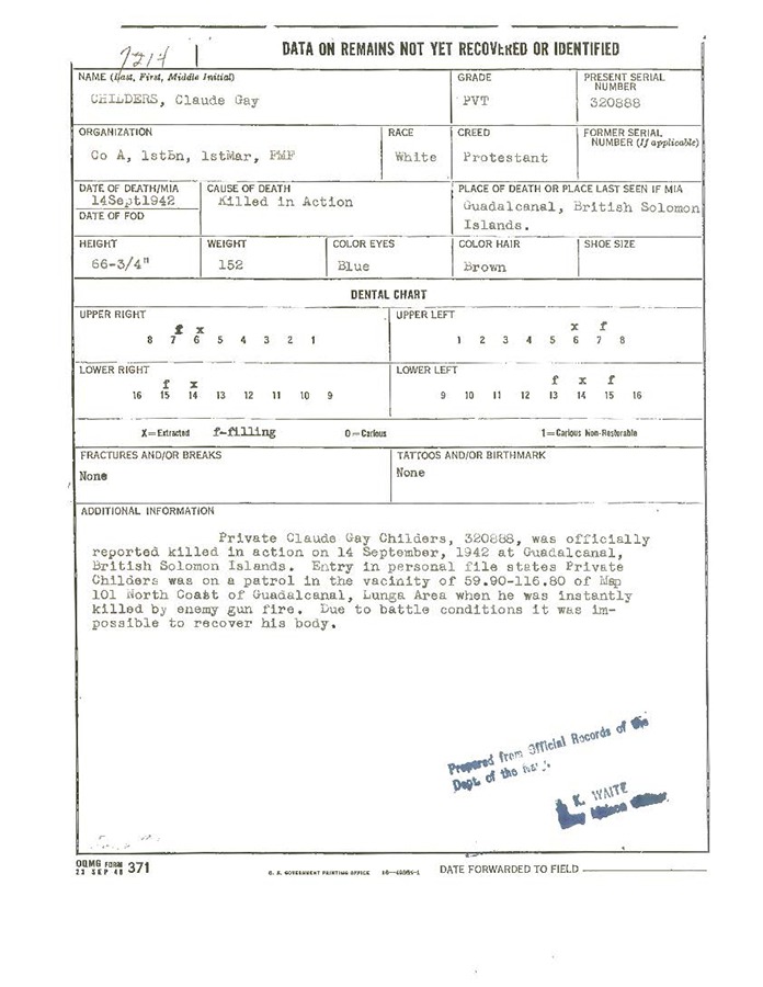 Private Childers was killed in action near the Lunga River, Guadalcanal.