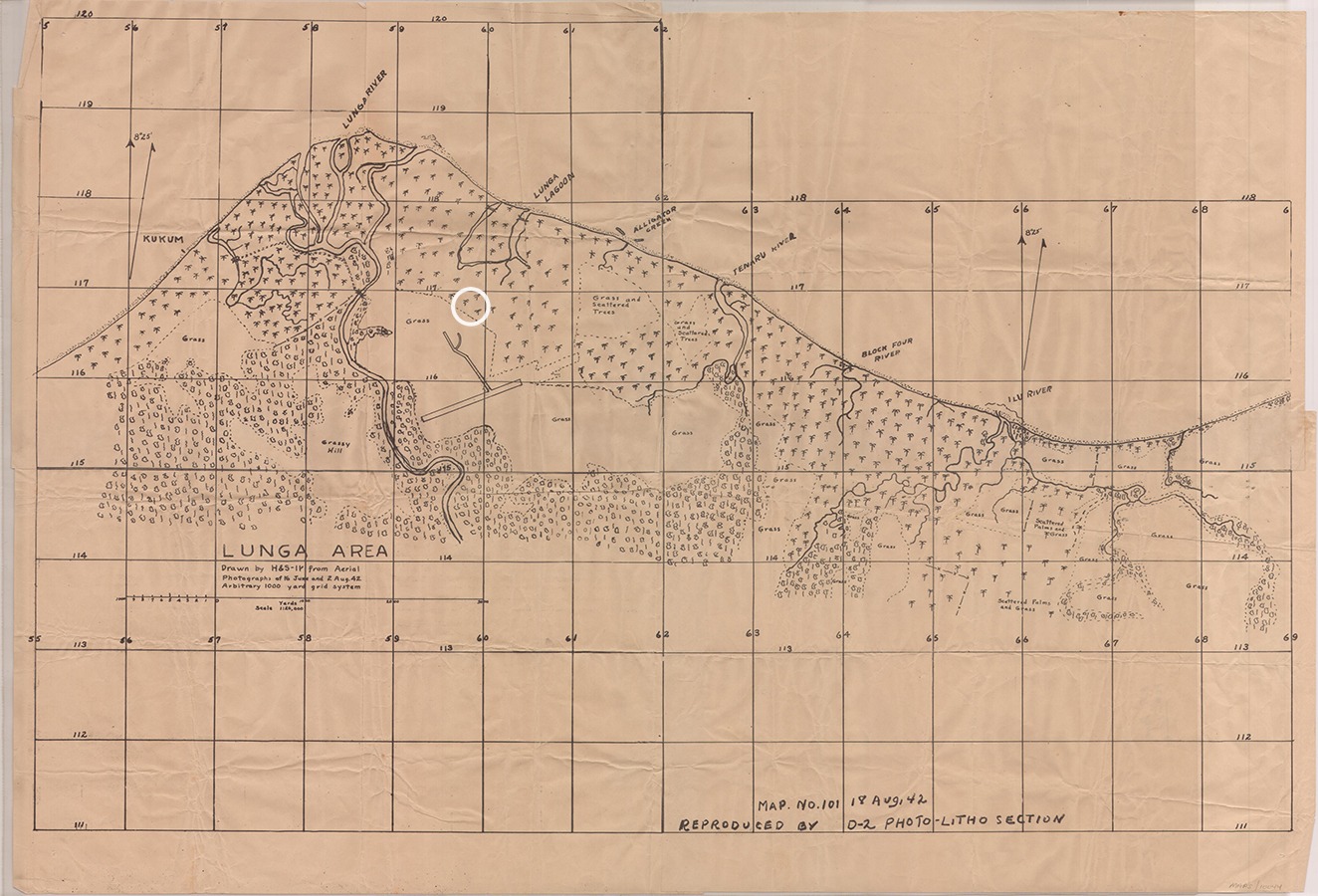 In 1947, a Graves Registration team arrived on Guadalcanal to conduct searches for those still missing or buried in the field. In addition to inhospitable conditions and a drastically changed battlefield, the team working on Childers’ Case 7214 faced two additional handicaps. First, the coordinates of the burial site were marked on Map 101 instead of the standard Map 104. Furthermore, plotting those coordinates placed the gravesite near Henderson Field. Not only does this disagree with reports of the patrol advancing up the Lunga River and fighting through an ambush – it means Childers would have been buried just a few hundred yards from the main cemetery on Guadalcanal. These coordinates are obviously incorrect, but the source of the error is unfortunately unclear.