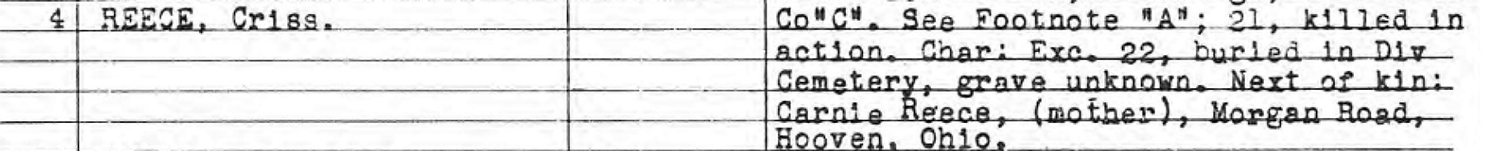 Sergeant Reece was killed in action during the landing operation; the official cause of death was noted as “gunshot wounds, head.” Although his death was confirmed by company officers, no specific location or burial information was recorded.