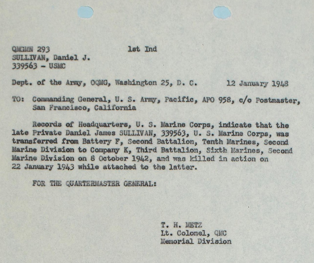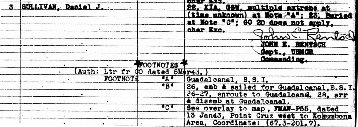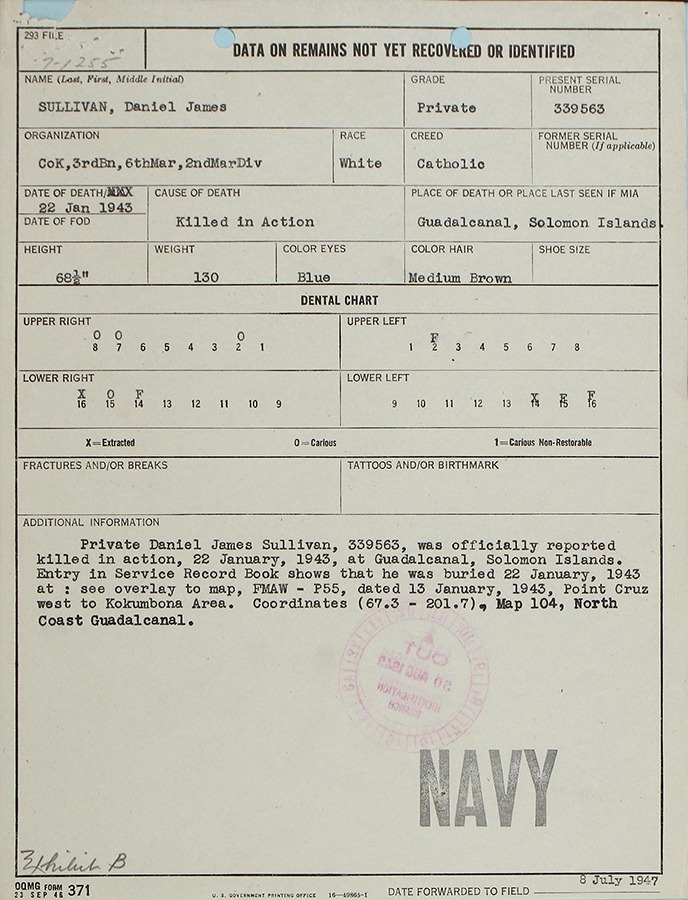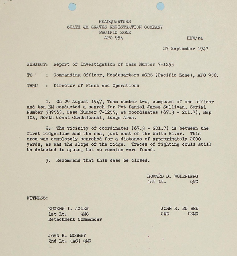 According to casualty reports, Sullivan’s body was buried in the field on the following day. His grave was marked on a map overlay that correlated with coordinates (67.3-201.7) on the standard Map 104 of Guadalcanal’s northern coast. Unfortunately, this location could not be located by post-war searchers.