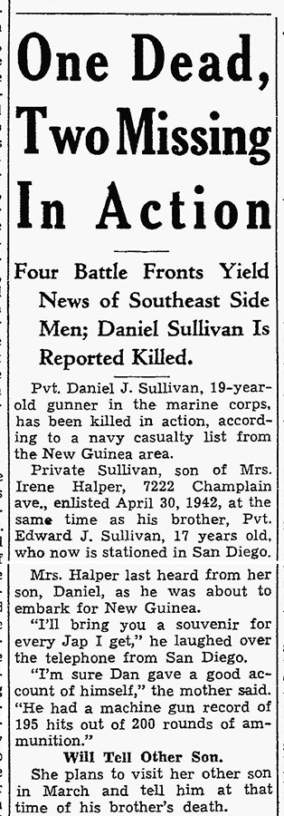 The battalion reported seventeen men wounded during the day’s advance, and four killed in action. Among the dead were the King Company skipper, 1Lt John L. Pratt – son of Goettge Patrol casualty LTCDR Malcolm L. Pratt – and Private Daniel J. Sullivan, a teenaged machine gunner from Chicago.