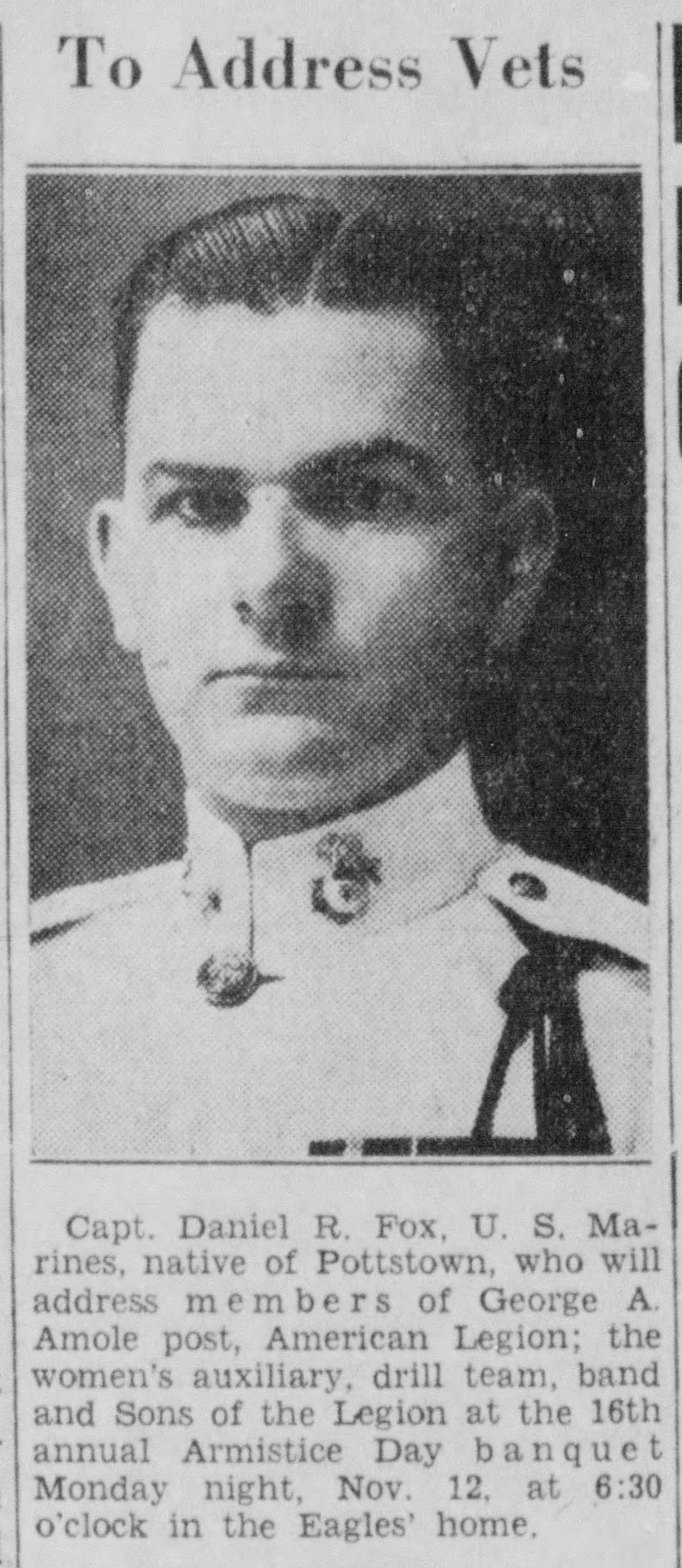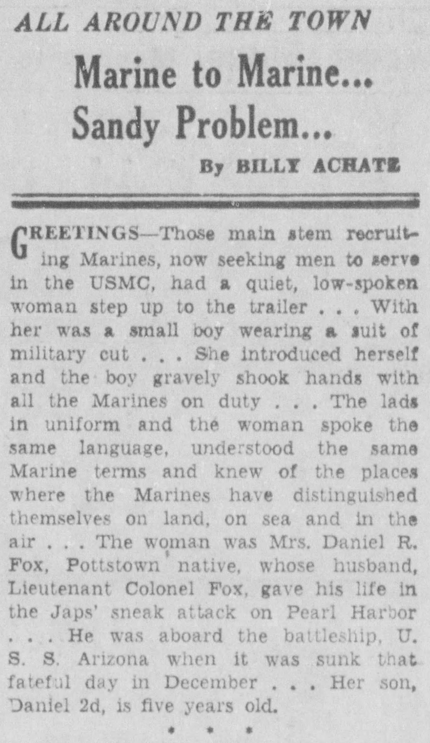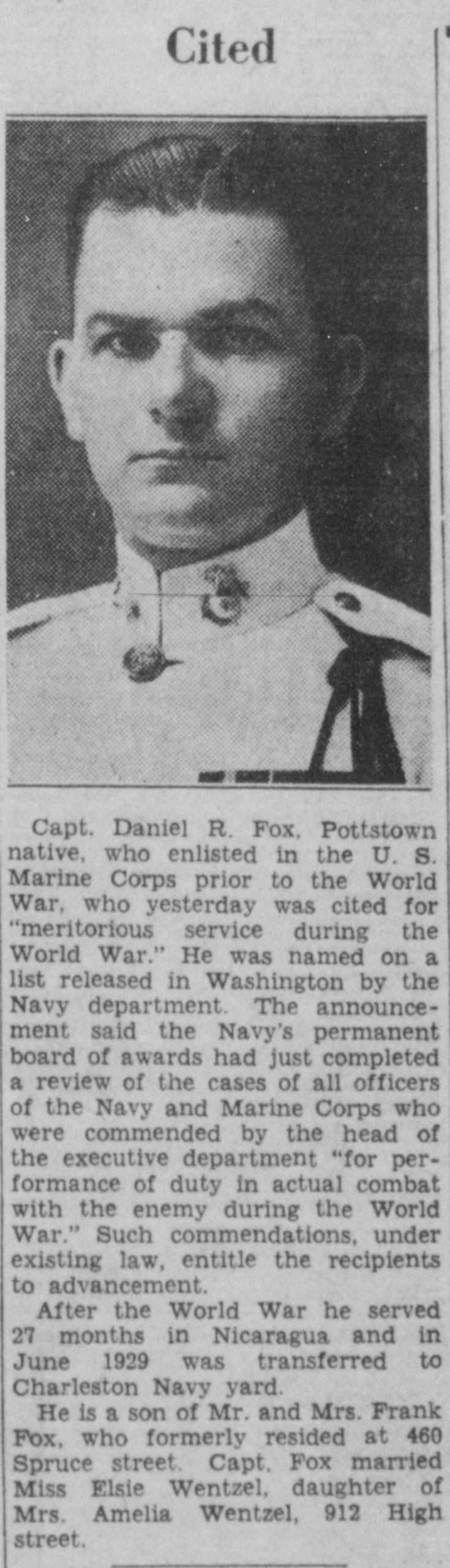 2. Lt. Col. Fox was not kin to my mother’s family, but “Uncle Danny” and my grandfather were very close. At the time before Pearl Harbor, both men were Lieutenant Colonels, both were Marines and both had served tours in Nicaragua and in Shanghai as “China Marines”. They spent a lot of time together, especially in Shanghai. “Uncle Danny” and his wife were frequent visitors to the Onley house and vice-versa. My grandfather was Colonel William Baynard Onley, USMC (USNA ’20), wife was Alma (Owens) Onley.