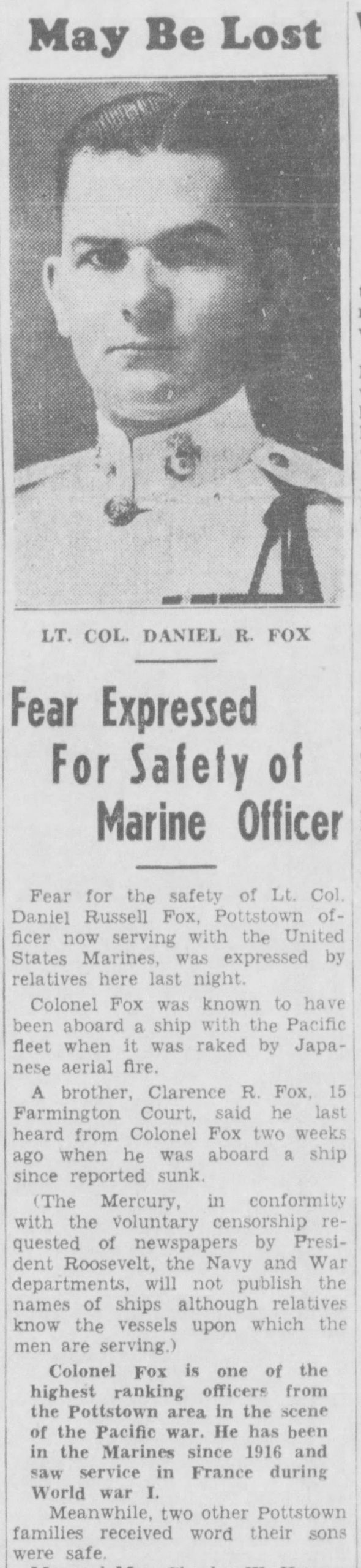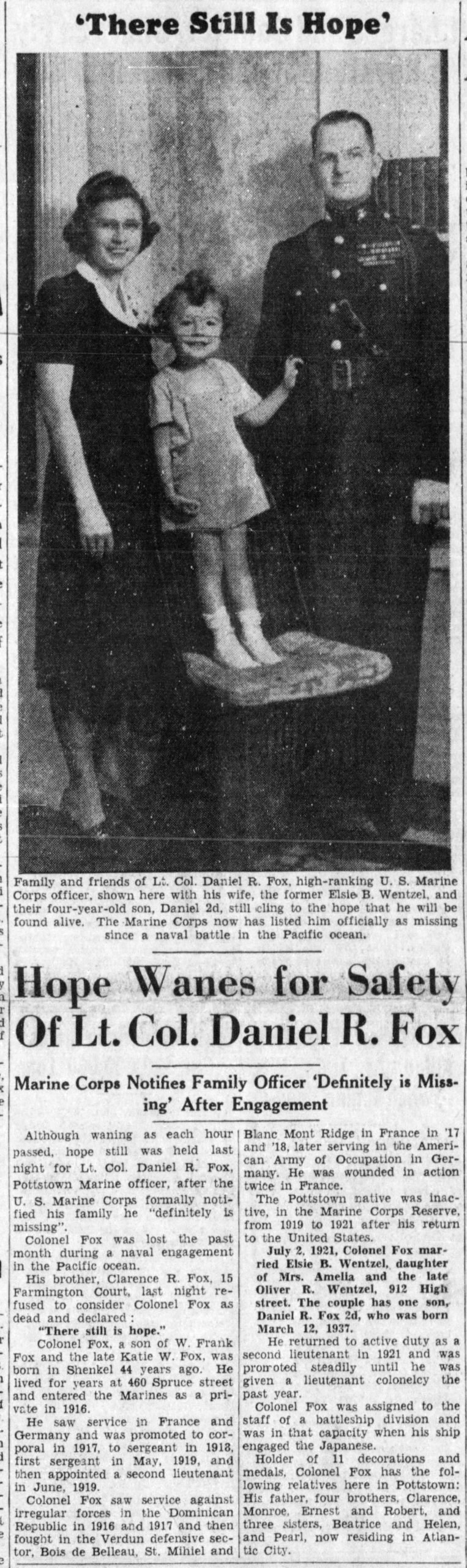 Lt. Col. Fox was not kin to my mother’s family, but “Uncle Danny” and my grandfather were very close. At the time before Pearl Harbor, both men were Lieutenant Colonels, both were Marines and both had served tours in Nicaragua and in Shanghai as “China Marines”. They spent a lot of time together, especially in Shanghai. “Uncle Danny” and his wife were frequent visitors to the Onley house and vice-versa. My grandfather was Colonel William Baynard Onley, USMC (USNA ’20), wife was Alma (Owens) Onley.