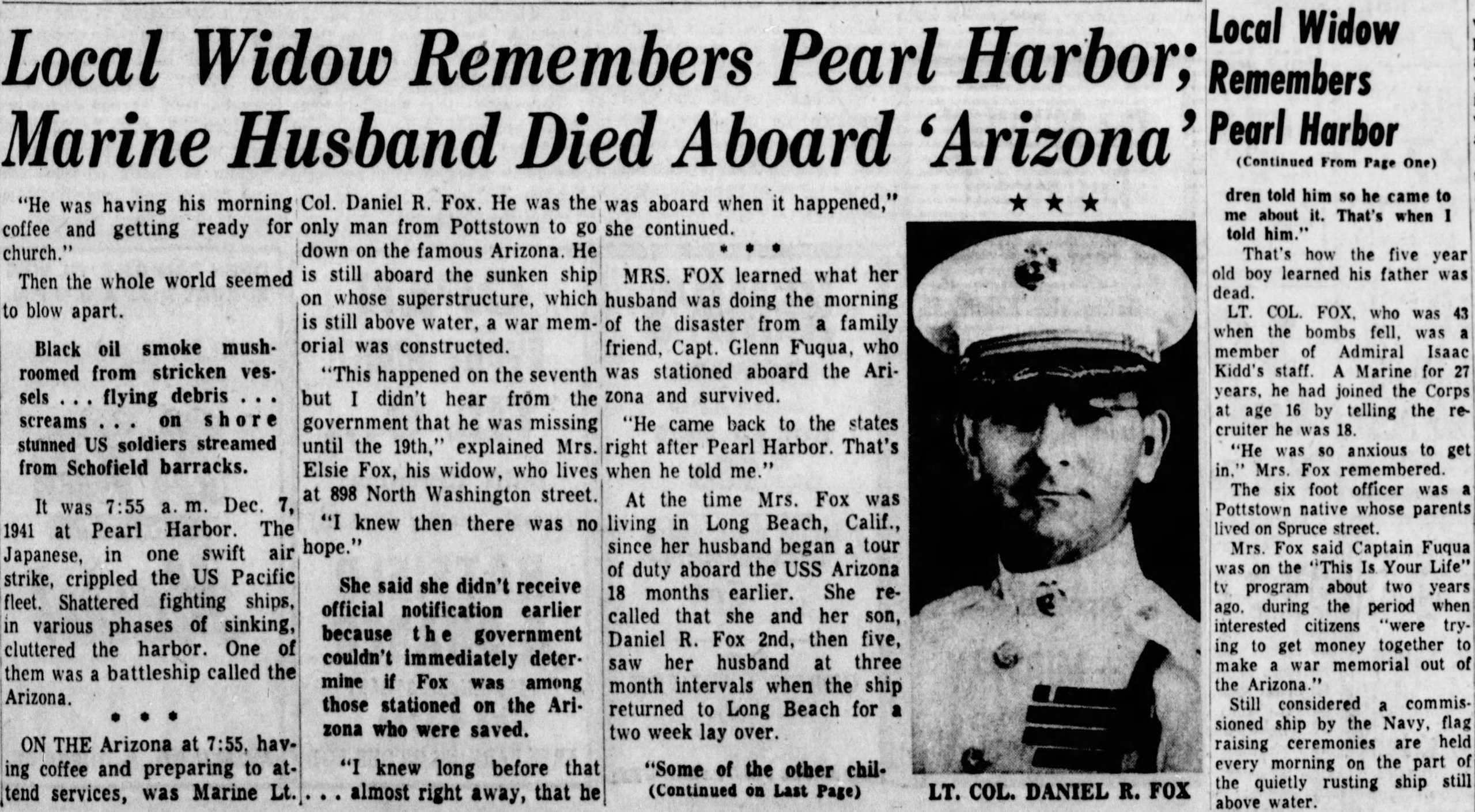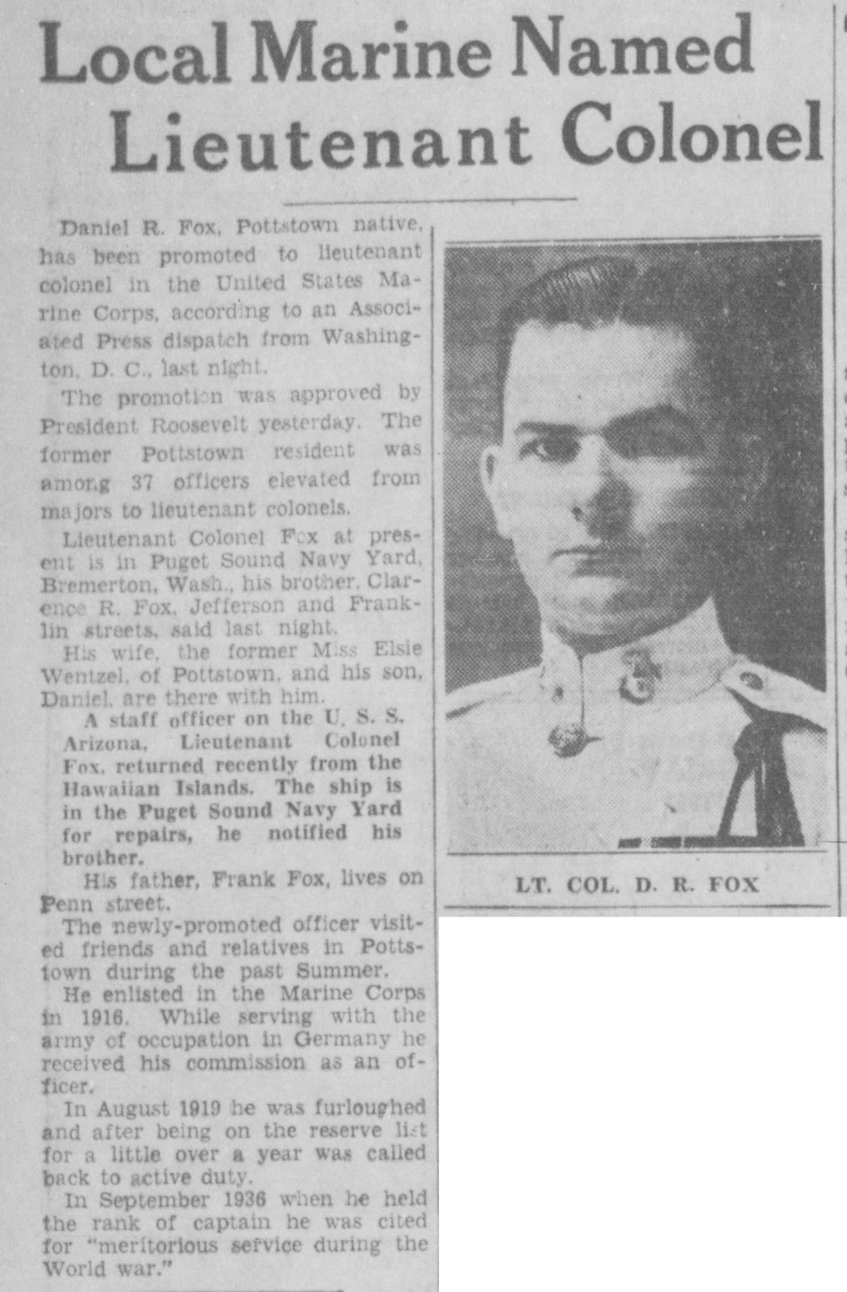 Lieutenant Colonel Daniel R. Fox, a highly-decorated veteran of the Great War who also saw service in Nicaragua and China, was assigned to Battleship Division One in July of 1940. He was the senior Marine officer on the staff of Rear Admiral Isaac C. Kidd, the Division commanding officer, and was berthed aboard the battleship USS Arizona.