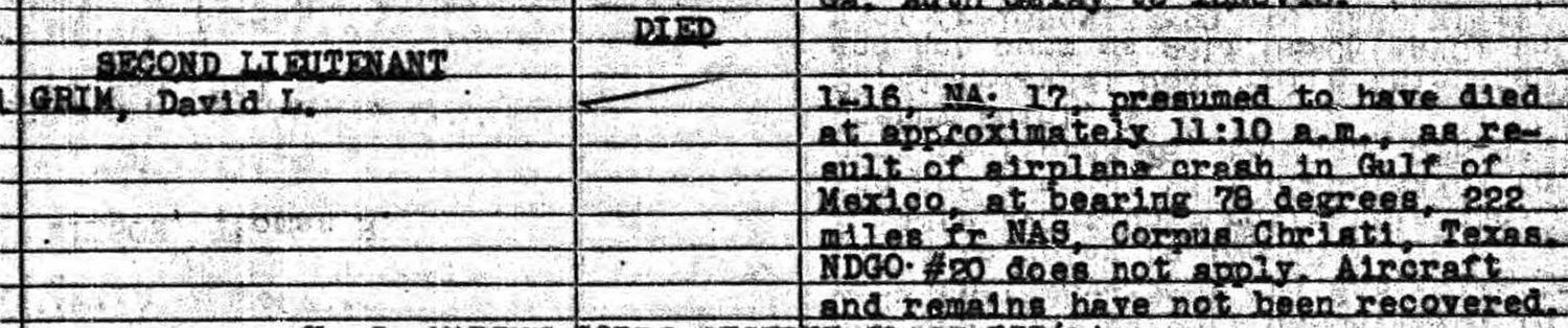 Lieutenant David Grim was a Marine pilot who trained at Naval Air Training Center (NATC) Corpus Christi, Texas. After earning his wings, he stayed on with the base air detachment to conduct training flights.