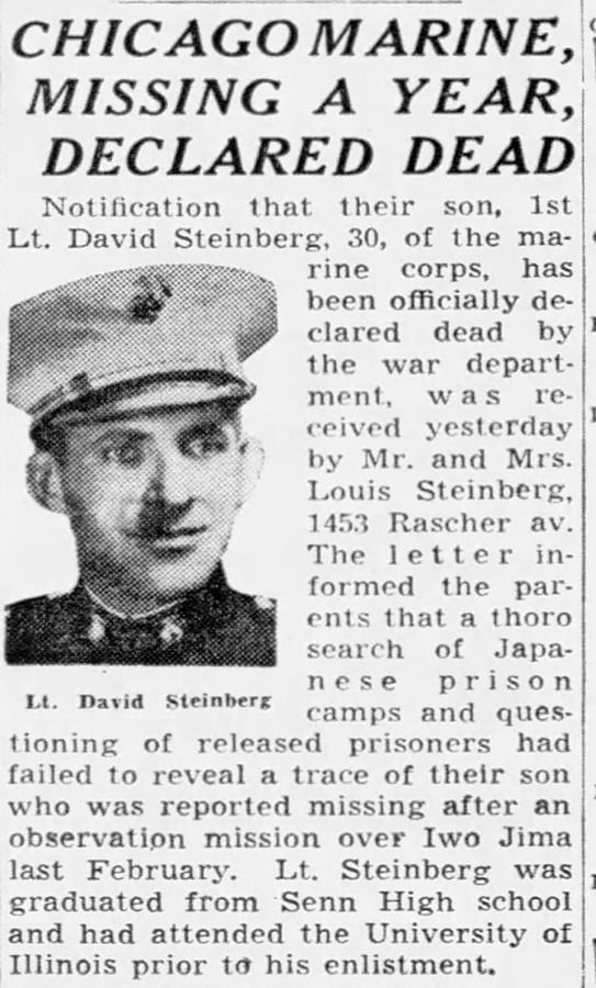 David Steinberg served as an aerial observer with the 13th Marines, the artillery regiment of the Fifth Marine Division. In January 1945, he was detached from his battalion and sent to the carrier USS Saratoga for duty during the invasion of Iwo Jima. Saratoga‘s squadrons specialized in night missions, and Steinberg flew with VT(N)-53 – a newly commissioned bomber squadron trained for such operations. On 19 February 1945 – D-Day at Iwo – Sara’s history proudly notes that “at 1858… a VT(N) was launched carrying a Marine Air Tactical Observer to Iwo Jima. This was the first time that night gunnery and troop movement observers had been used in amphibious operations at night.” Some teething problems occurred, but all hands seemed confident in this new aspect of warfare.