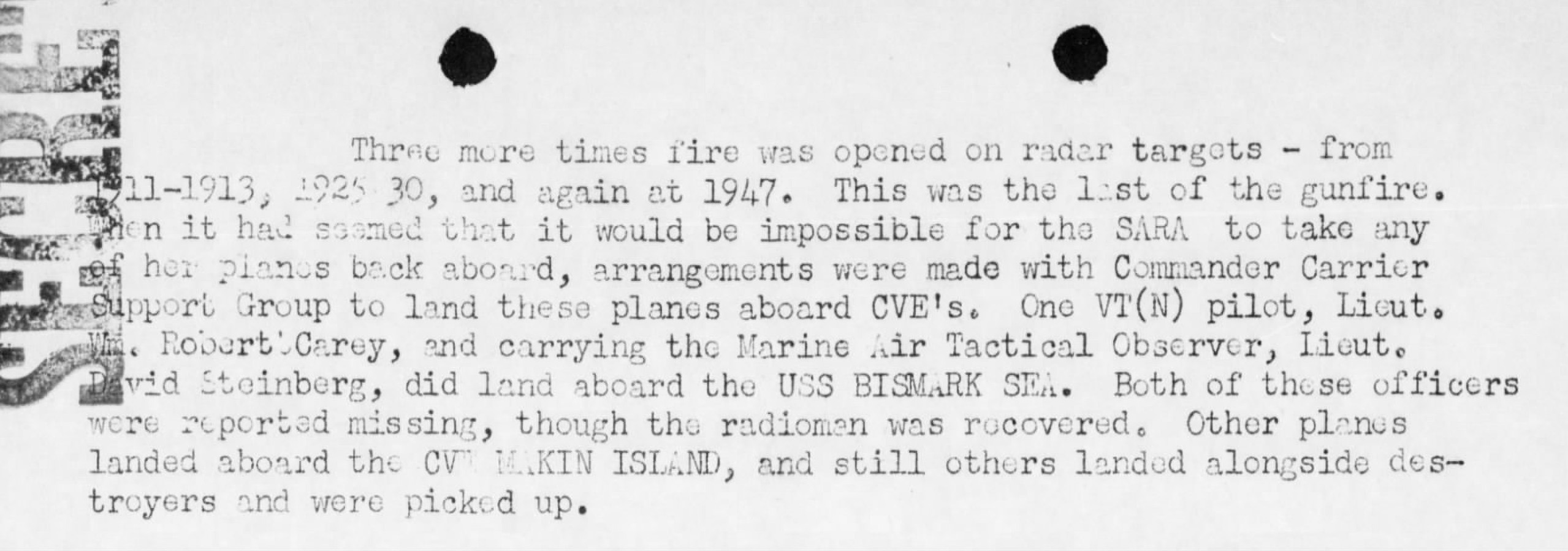As Saratoga prepared to launch her first strike on the afternoon of 21 February, worrying reports of incoming hostile aircraft reached the bridge. The carrier went to General Quarters and started clearing the flight deck, launching as many aircraft as she could. One VT(N)-53 bomber managed to take off – this was probably Steinberg’s plane, with Lt(j.g.) William R. Carey and an unnamed enlisted radioman aboard. Less than ten minutes later, an intense kamikaze attack descended on Sara, blasting holes in the flight deck and starting major fires. The carrier was unable to recover any of her planes, and sent out a call to the task force to allow her pilots to land wherever possible. The USS Bismarck Sea (CVE-95) reported “taking aboard…. one SARATOGA TBM which was looking for a place to land.”