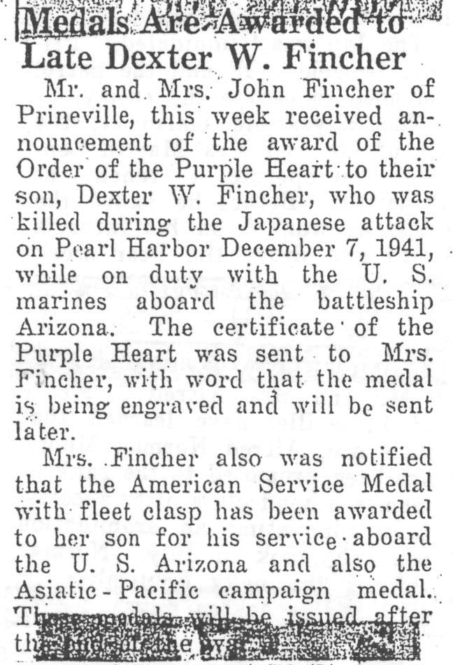 | CIRCUMSTANCES OF LOSS Sergeant Dexter W. Fincher was a member of the Marine detachment aboard the battleship USS Arizona. He was aboard on 7 December 1941 when his ship was bombed and sunk by Japanese aircraft at the battle of Pearl Harbor. Fincher’s remains were never identified, and are believed to rest aboard the Arizona to this day. Note: No relation to fellow Arizona casualty ACK Allen Brady Fincher. |