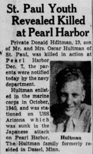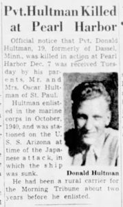 | CIRCUMSTANCES OF LOSS PFC Donald S. Hultman was a member of the Marine detachment aboard the battleship USS Arizona. He was aboard on 7 December 1941 when his ship was bombed and sunk by Japanese aircraft at the battle of Pearl Harbor. Hultman’s remains were never identified, and are believed to rest aboard the Arizona to this day. |