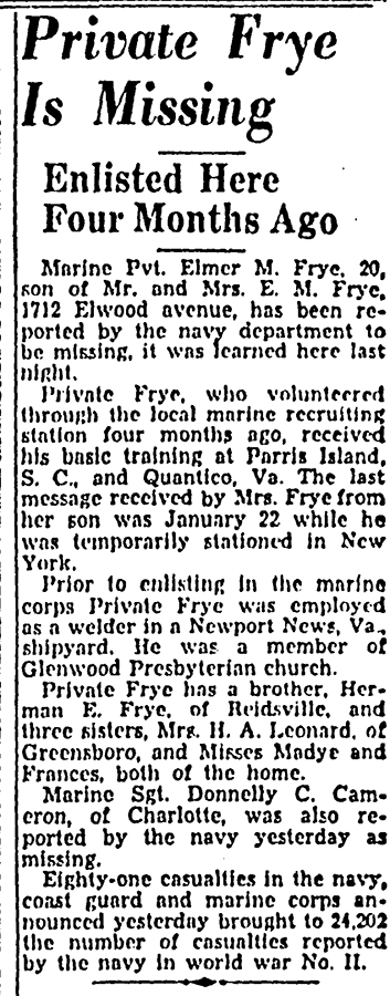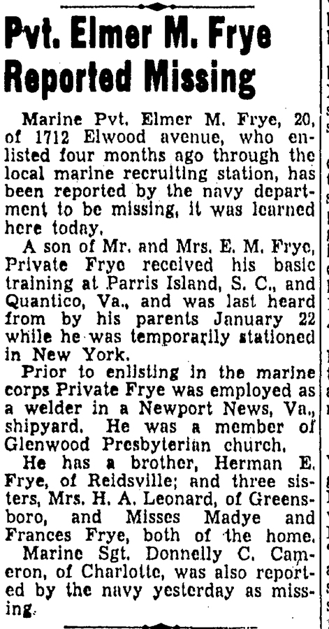 Body lost at sea. Frye was officially declared dead on 8 February 1944.
