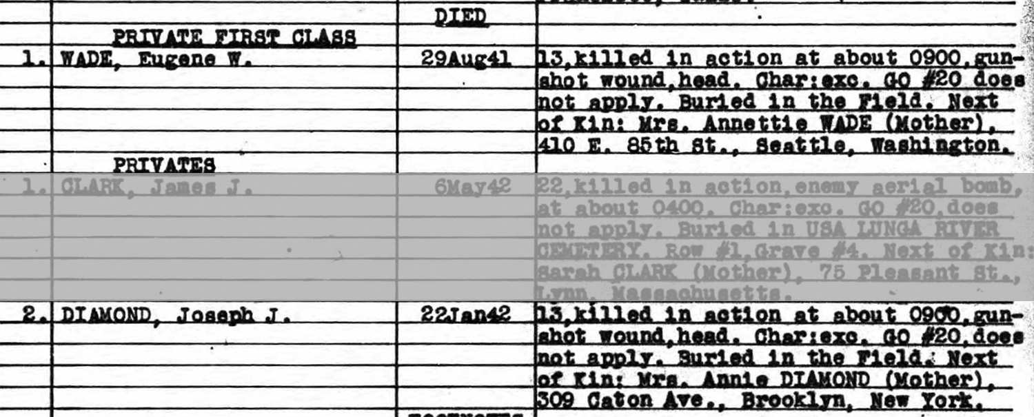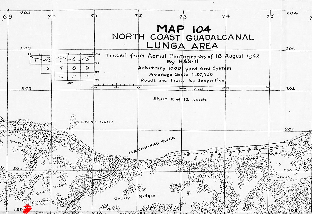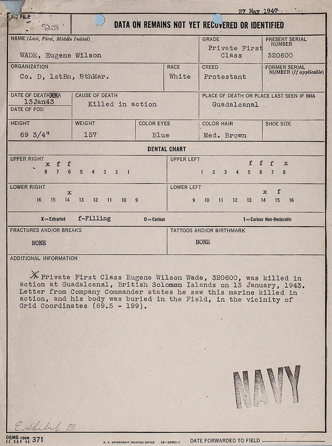 PFC Wade was reportedly buried in the field at (69.5-199) on the standard Map 104 of Guadalcanal’s northern coast. The grave could not be located by post-war searches.