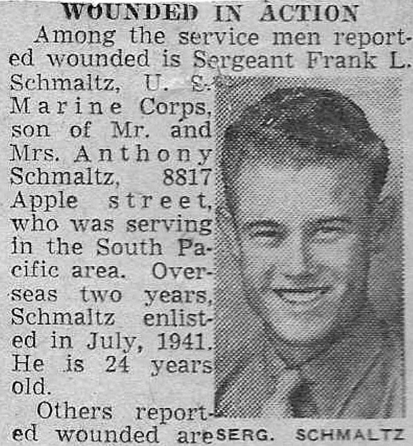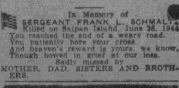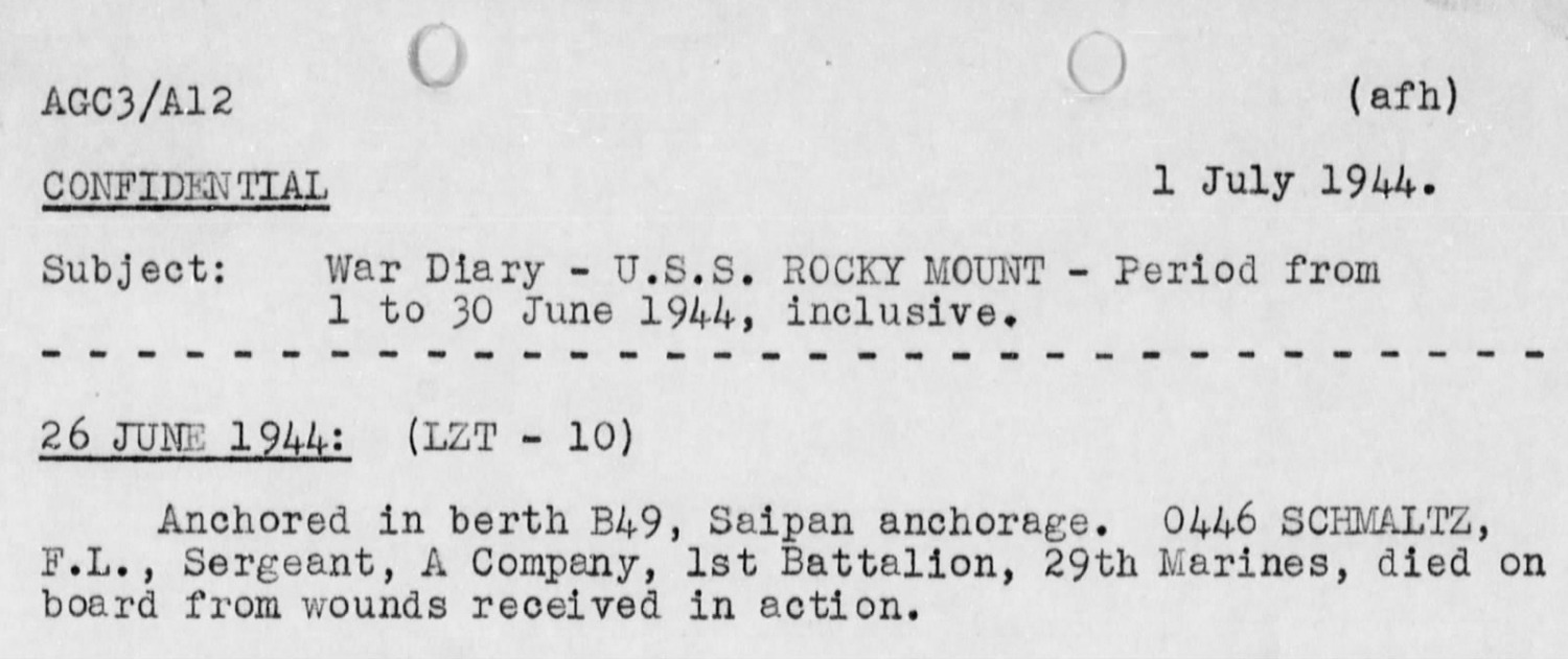 Schmaltz was mortally wounded on Saipan and died aboard a hospital ship offshore.