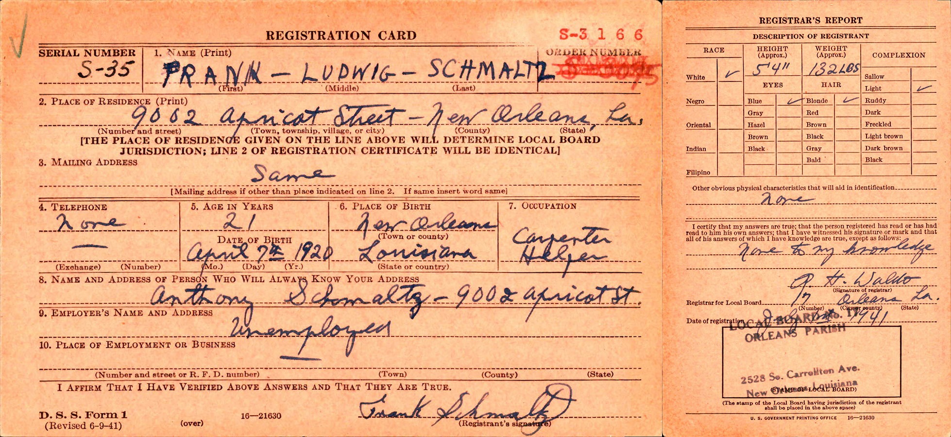 Address of parents, Anthony & Elfrida Schmaltz.