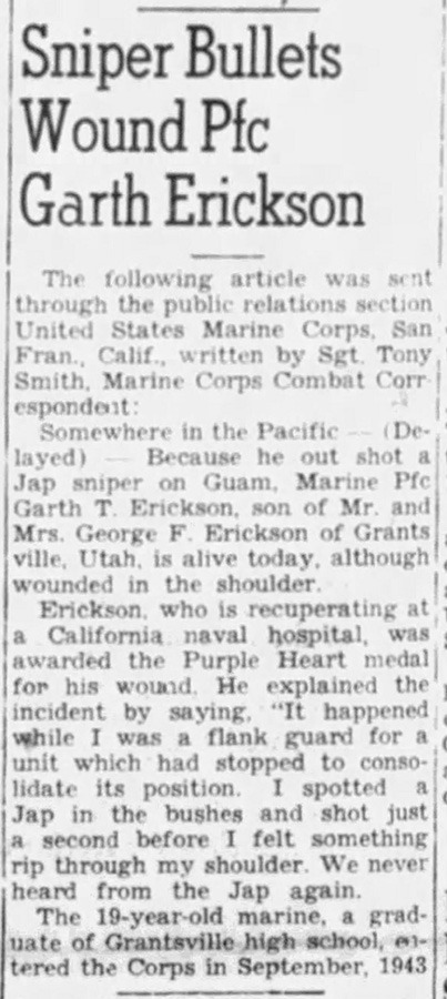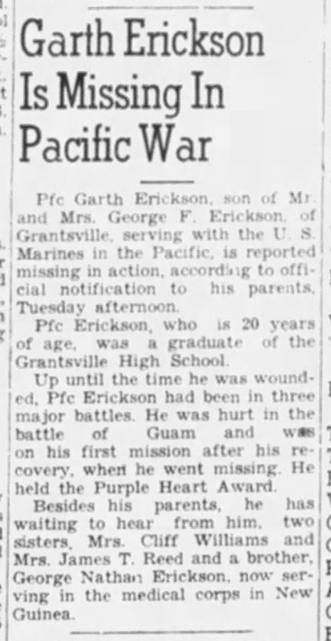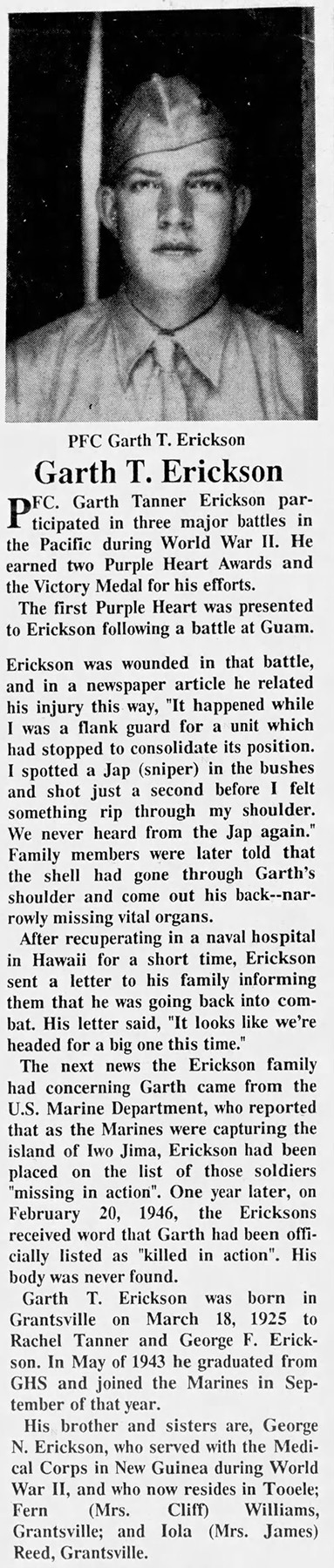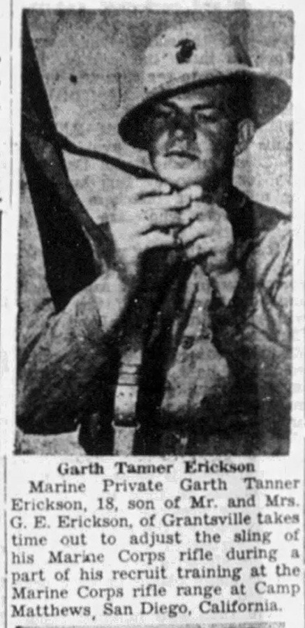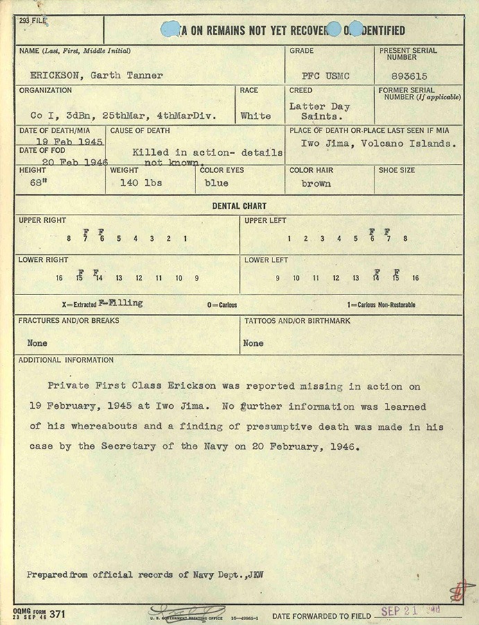 One of those lost in the first day’s fighting was PFC Garth T. Erickson. He was a combat veteran, having fought at Guam with C/1/9th Marines (Third Marine Division) until a sniper’s bullet sent him to the hospital; he joined I/3/25th Marines after recovering. He essentially disappeared on Iwo Jima – reported as missing in action by his company, with no surviving eyewitnesses to provide further clues or confirm his death.