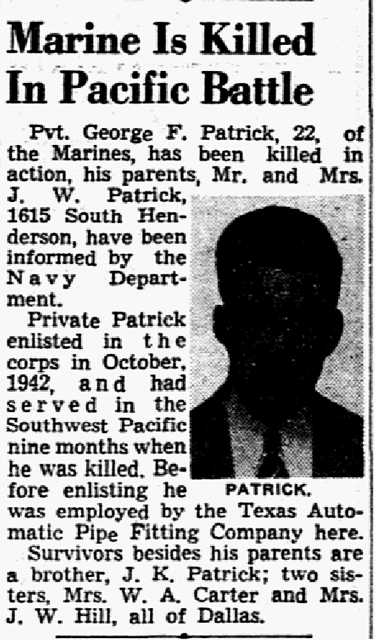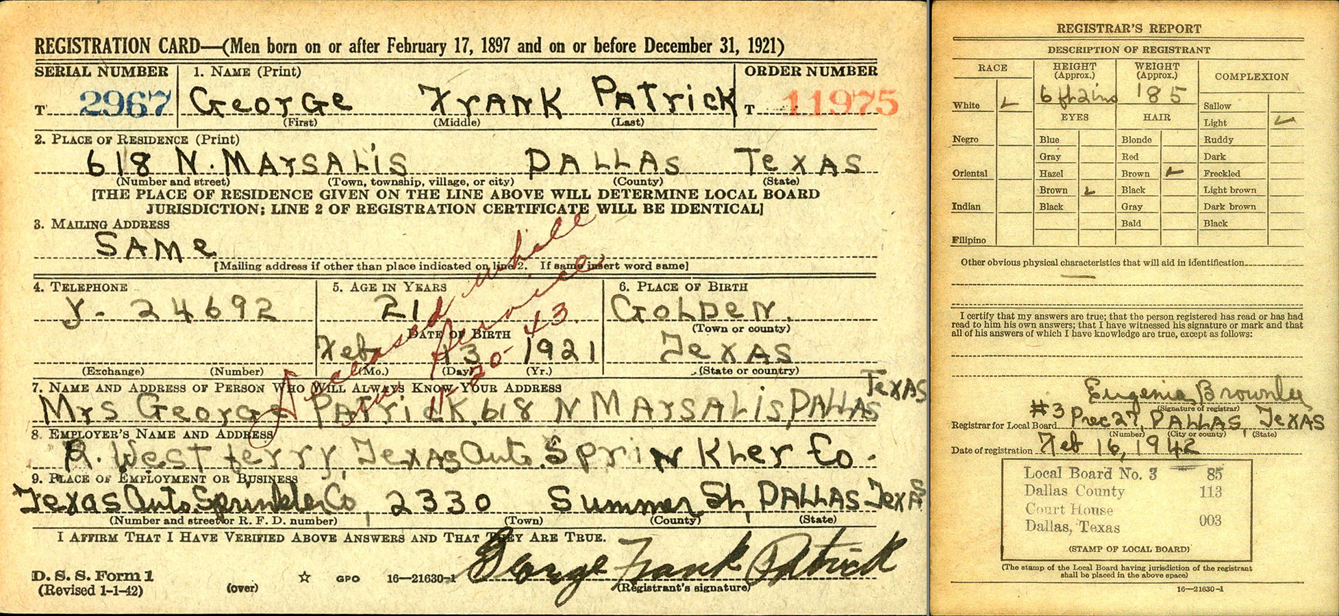 George Patrick was born in Golden, Texas on 13 February 1921. He was the last of six children born to James and Martha (Champion) Patrick, and grew up on farmsteads in Wood and Hopkins Counties. Few other details about his youth are readily available.