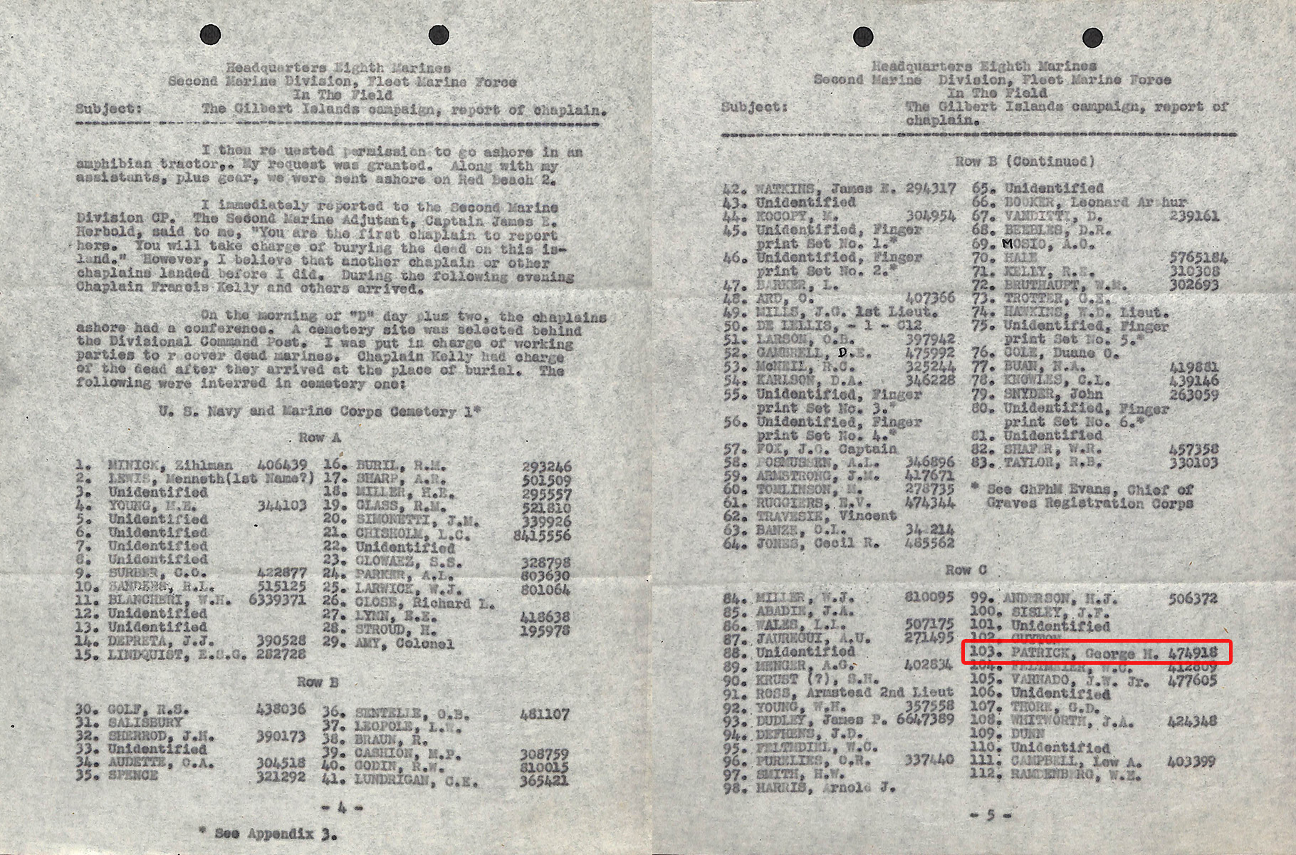 George Patrick was one of only three Dog Company Marines buried in a marked and identified grave on Betio – which should have been a help to post-war efforts to recover his body. However, record confusion struck again, and Patrick was reportedly buried in two different locations: Grave 103, Row C, Division Cemetery #1, or Grave 27, Row A, East Division Cemetery.