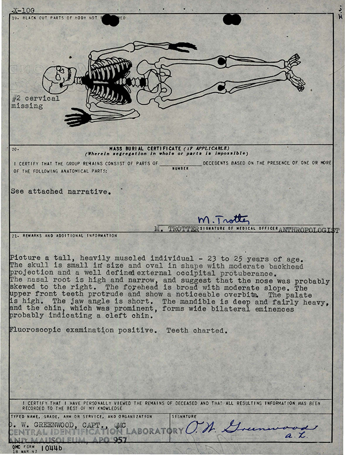 Decades later, a DPAA directive led to the exhumation of unidentified remains in the National Memorial Cemetery of the Pacific. Using modern identification methods, the remains of X-100 were positively associated with George Patrick. He had been buried in “Division Cemetery 1” after the battle, recovered in 1946 but not identified, and lay in Plot E, Grave 410 of the “Punchbowl” for nearly seventy years.