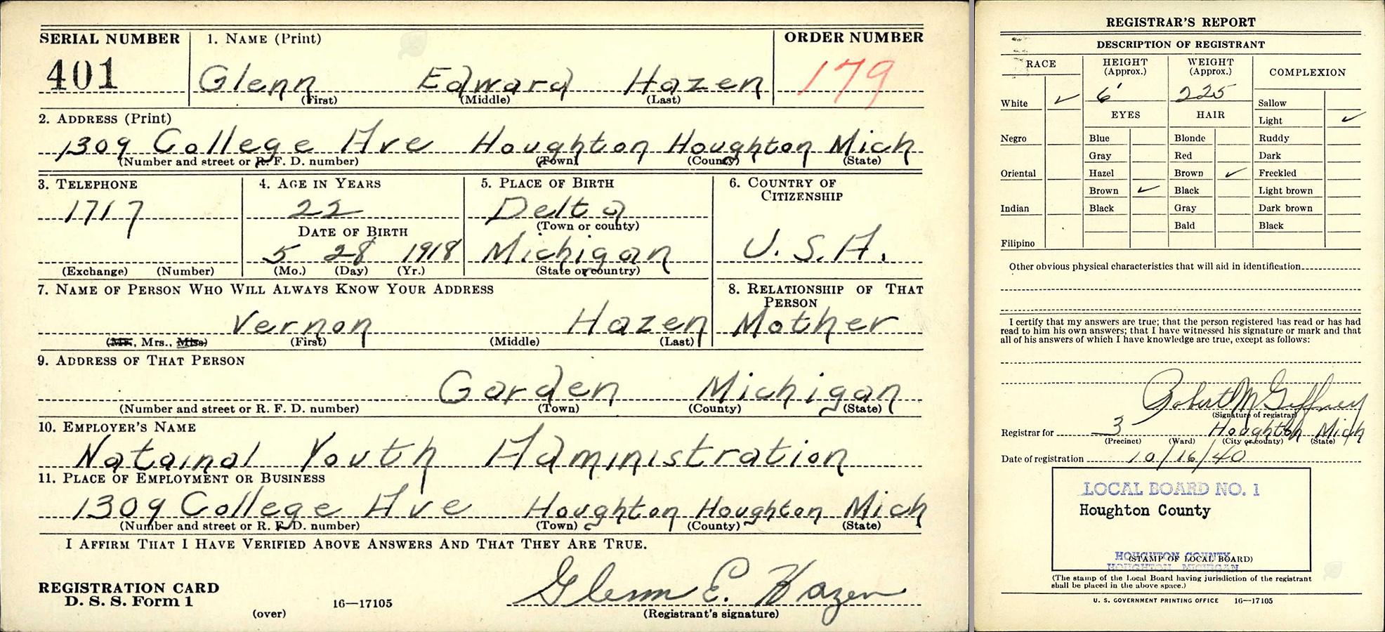 | DATE OF BIRTH May 28, 1918 at Garden, MI |