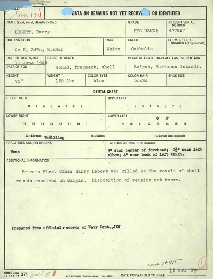 At some point on 16 June 1944, a mortar shell landed on the King Company line, and Private First Class LeBert fell with multiple shrapnel wounds. He was evidently evacuated to the beach; at least, this was the last King Company knew of his whereabouts. Muster rolls erroneously list LeBert as present for the battle of Tinian in July-August 1944. It was not until September that official records noted his absence, and he was reported as “missing in action.”