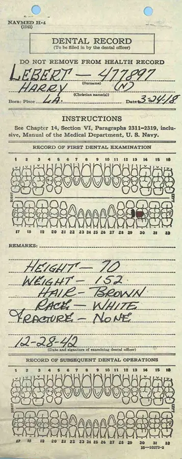 Harry LeBert, a carpenter from Lake Charles, Louisiana, enlisted in the Marine Corps on 3 November 1942 – leaving behind his wife and two young children, Robert and Barbara. His baptism of fire came at Betio in the Tarawa atoll on 21 November 1943 – but LeBert never even made it to shore. A Japanese artillery shell exploded in his LCVP, leaving the Louisianan with shrapnel wounds in his arms, legs, and buttocks. He was immediately evacuated to the USS Heywood for treatment and hospitalized for a few weeks. This wound may have saved his life, for the present: King Company lost 38 Marines killed in action at Tarawa, most of whom have never been recovered.