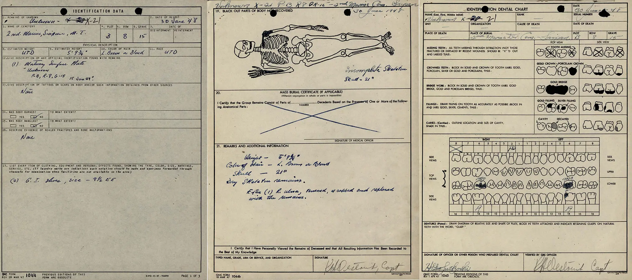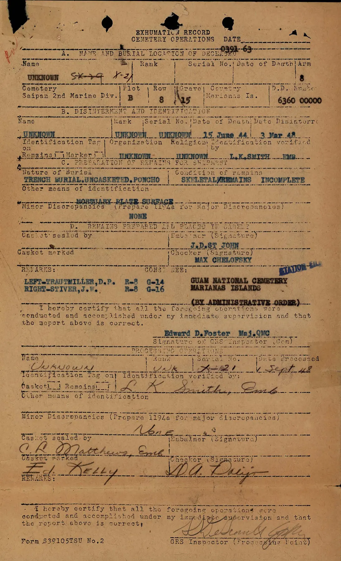 PFC LeBert never made it off Saipan. He appears to have died of his wounds shortly after leaving the front lines, and his body was brought to the Second Marine Division Cemetery. Unluckily, LeBert was not carrying any form of identification, and was thus buried in Plot B, Row 8, Grave 15 as “Unknown X-21.” The remains were exhumed in 1948 and sent for laboratory analysis, but technology of the time was unable to reach a definite conclusion. “X-21” was buried in an “Unknown” grave at Fort McKinley in Manila; PFC LeBert was officially determined “non-recoverable” in 1949.