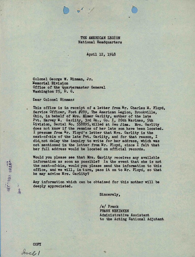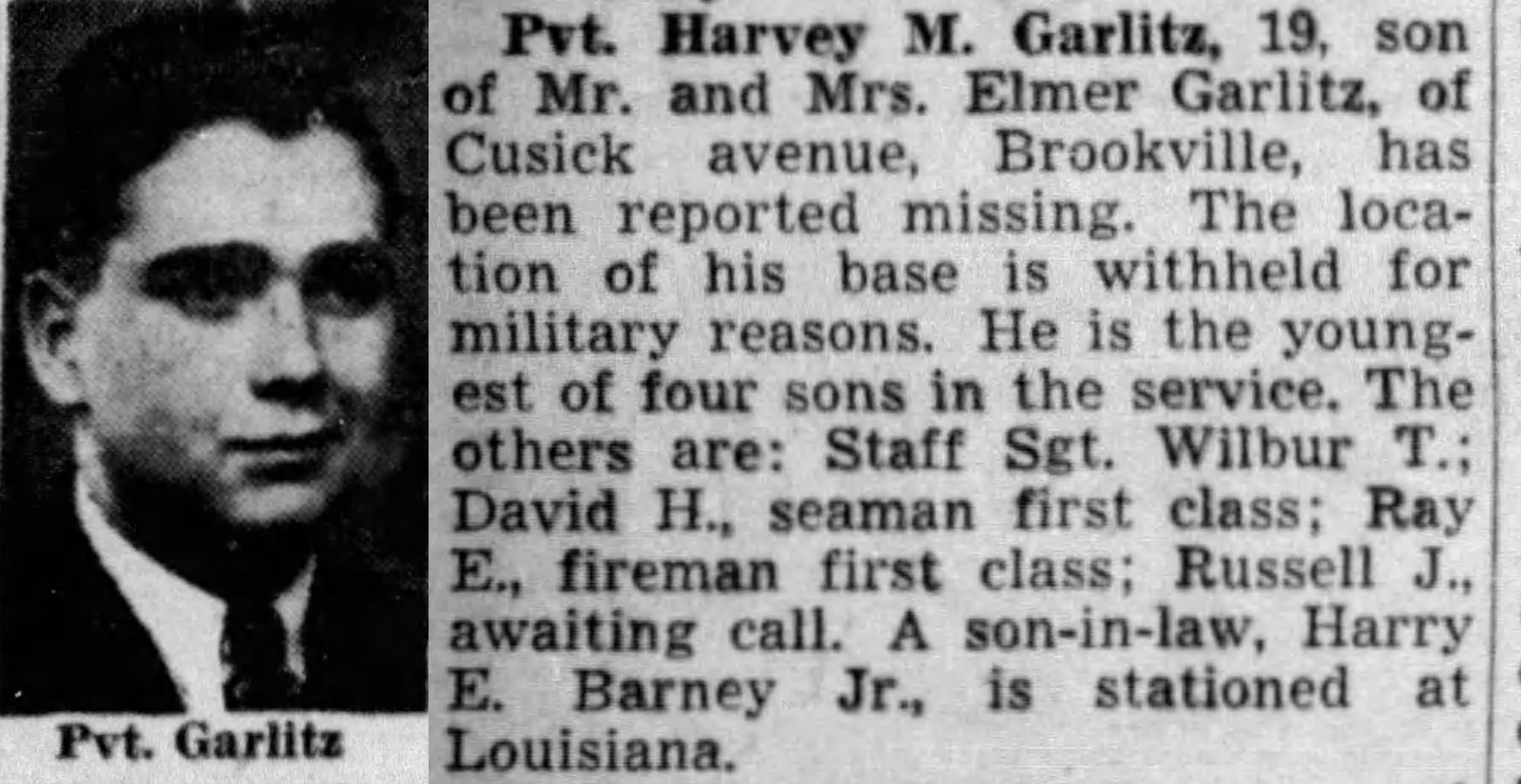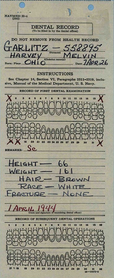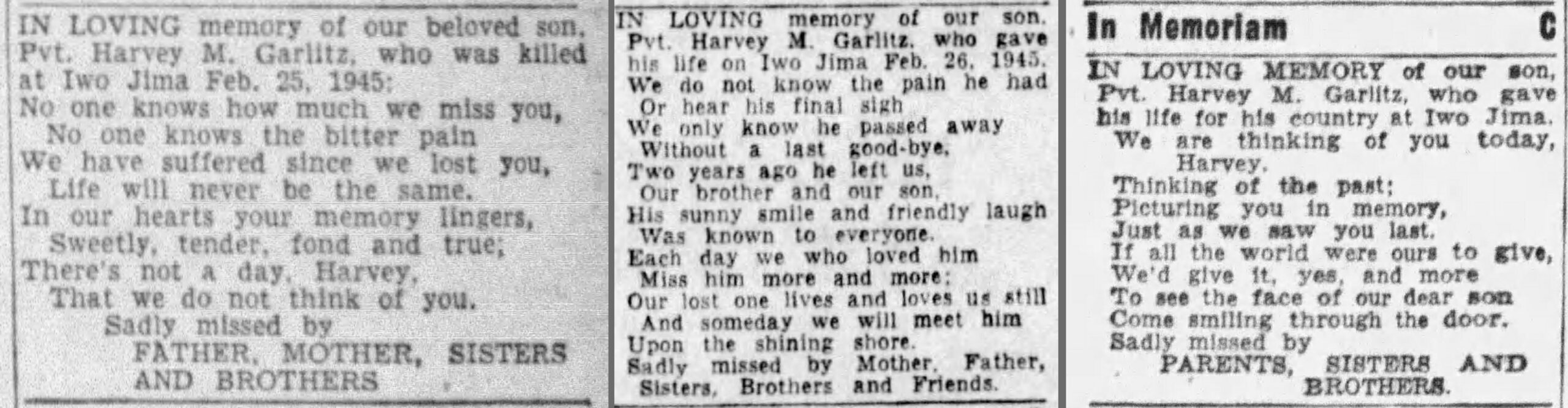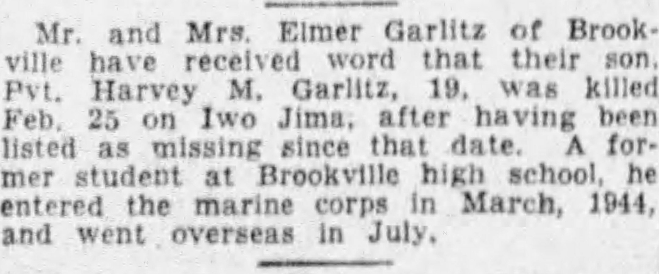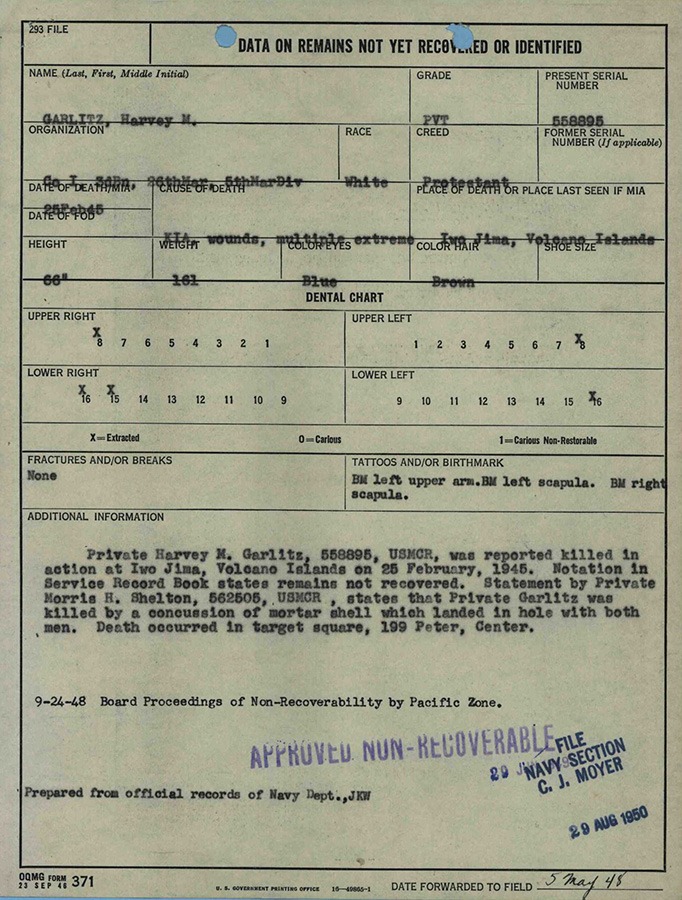 Private Harvey Garlitz was one of several Item Company Marines killed during the day’s action. His absence was noticed on the morning of 26 February, and he was reported as missing in action. However, an eyewitness report from Private Morris H. Shelton soon corrected the record. Shelton recalled seeing Garlitz and another Marine taking shelter in a foxhole just before a shell scored a direct hit. Both men were killed; Shelton said that Garlitz died from the concussive effects of the blast.