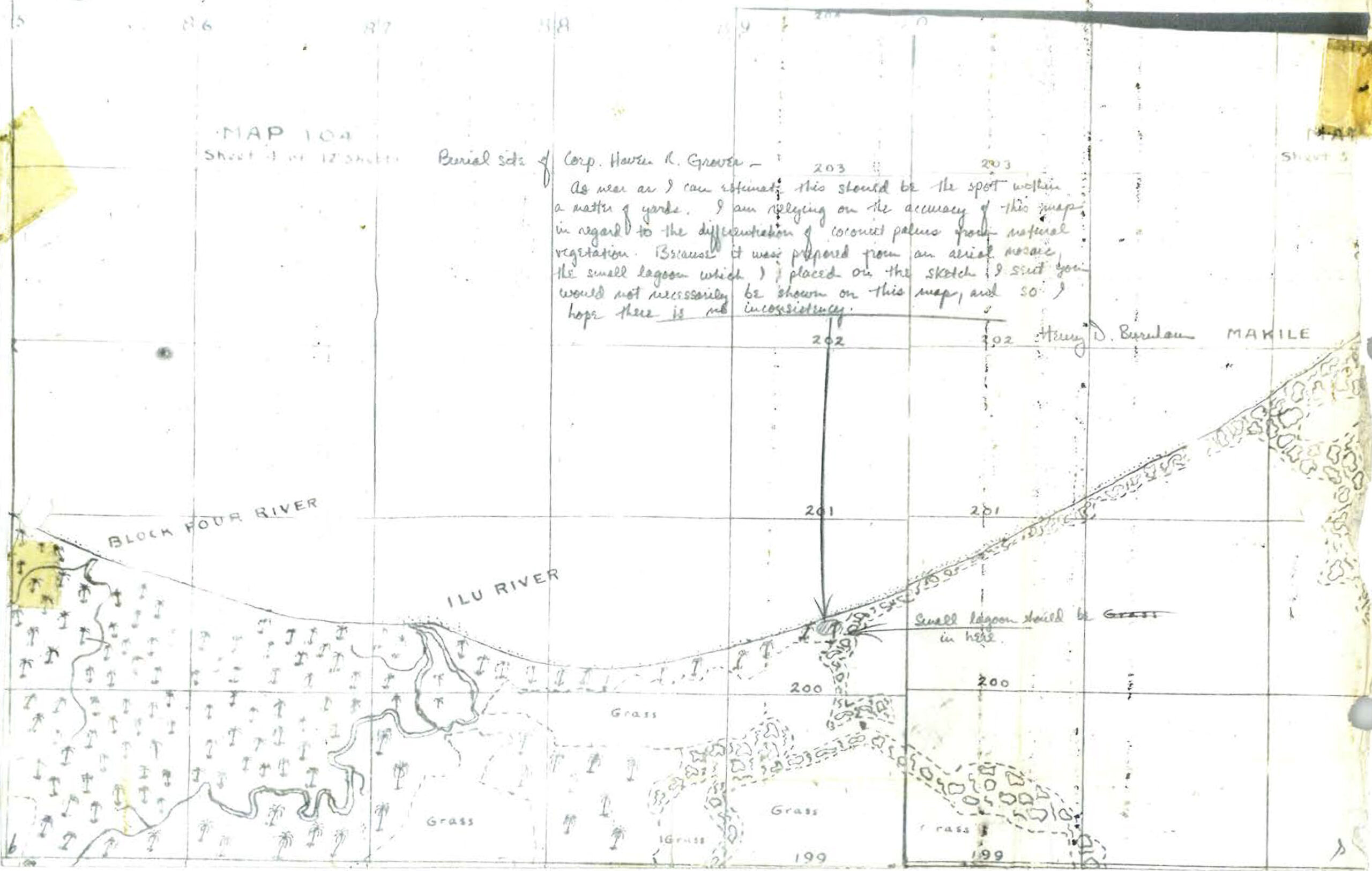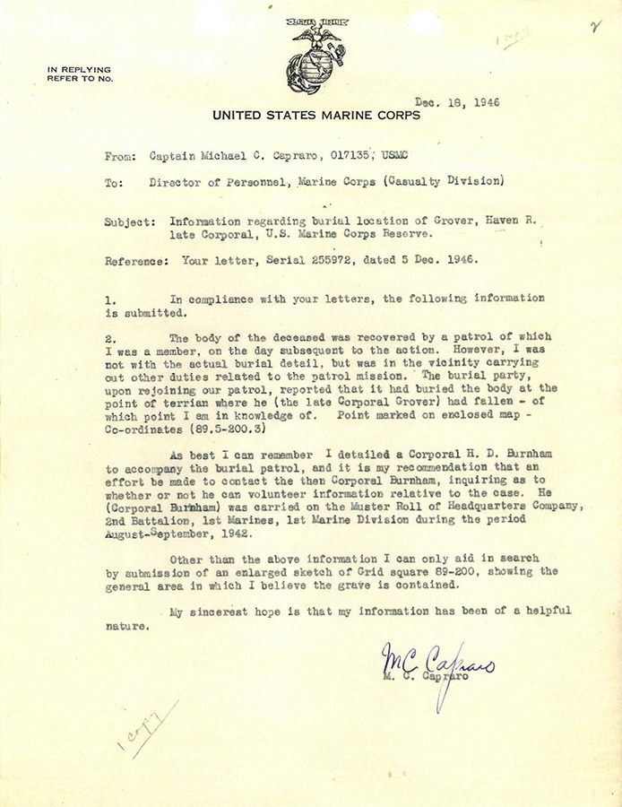 In 1946, the USMC Casualty Division contacted Captain Michael C. Capraro, formerly of the Second Battalion, 1st Marines. Capraro, a platoon sergeant on Guadalcanal, participated in the patrol that located and buried Grover’s remains. “I was not with the actual burial detail, but was in the vicinity carrying out other duties related to the patrol mission,” he wrote. “The burial party, upon rejoining our patrol, reported that it had buried the body at the point of terrain where he (the late Corporal Grover) had fallen.” Crucially, Caprano transposed the coordinates onto the standard Map 104 – creating an intersecting point.