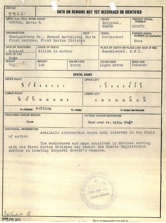 Grover’s Marine Corps casualty card notes that his remains were interred at a specific point on “Map 101,” the standard grid used by the 1st Marines at this point of the battle. Unfortunately, the coordinates given – “65.114, 67.115” – do not intersect on the grid system. The resulting area is approximately 4,000 square yards – similar to the case of PFC Ambrose I. Rice.