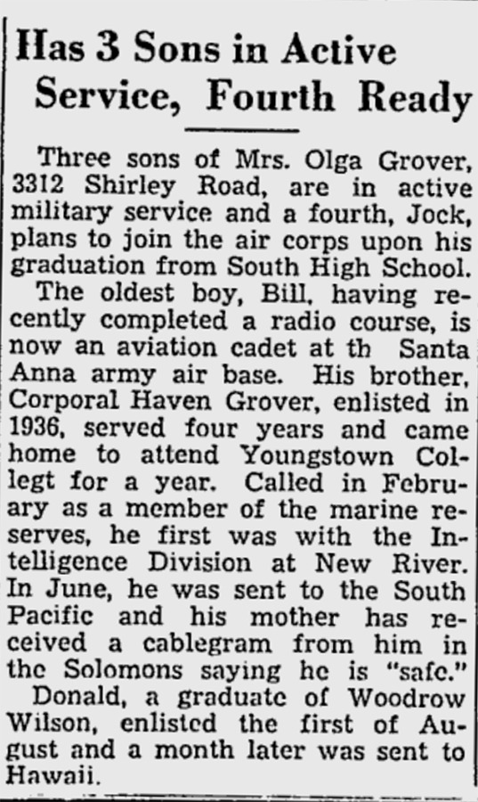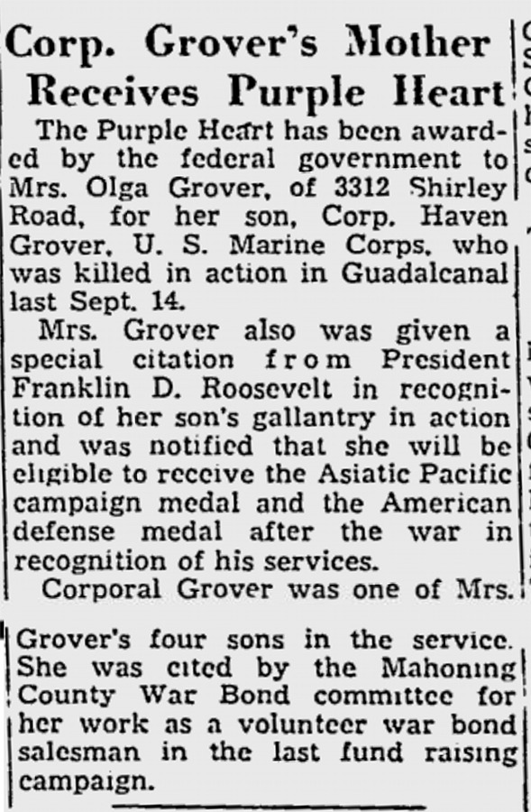 Thank you for this information. Haven, or Hank as he was known, was my uncle. His Marine photo, his Purple Heart award, and a letter of recognition from Franklin D. Roosevelt for his sacrifice (KIA September 14, 1942 – Guadalcanal) are prominent in my office.