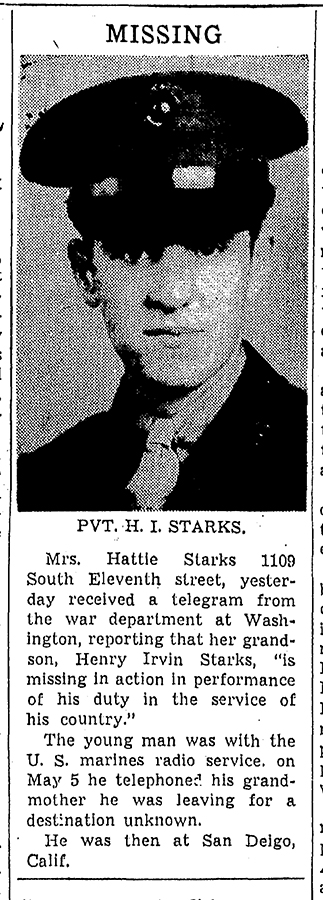 (1) Thanks are due to Jim and Steve Cox (the son and grandson of Dorothy Starks Cox) for their help in clearing up the Starks family tree. The future Marine appears on the 1940 census as “Irvin Starks,” indicating that he was called by his middle name.