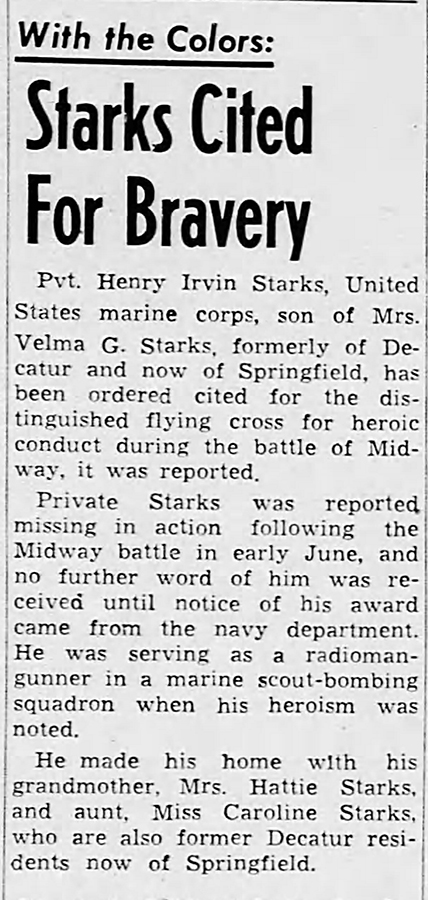 My name is Jim Cox and I am the eldest nephew (72) of Pvt. Henry I. Starks. His sister, my mom (Dorothy), never knew the details concerning Henry’s death. She died before all the “Midway” books started to come out with how he died. He’s mentioned in several books that I have found. Our family greatly appreciates getting the facts. Needless to say, we are very proud of Henry. Besides myself, there are two nieces still living, Sue and Patti, plus several grand nephews and grand nieces.
