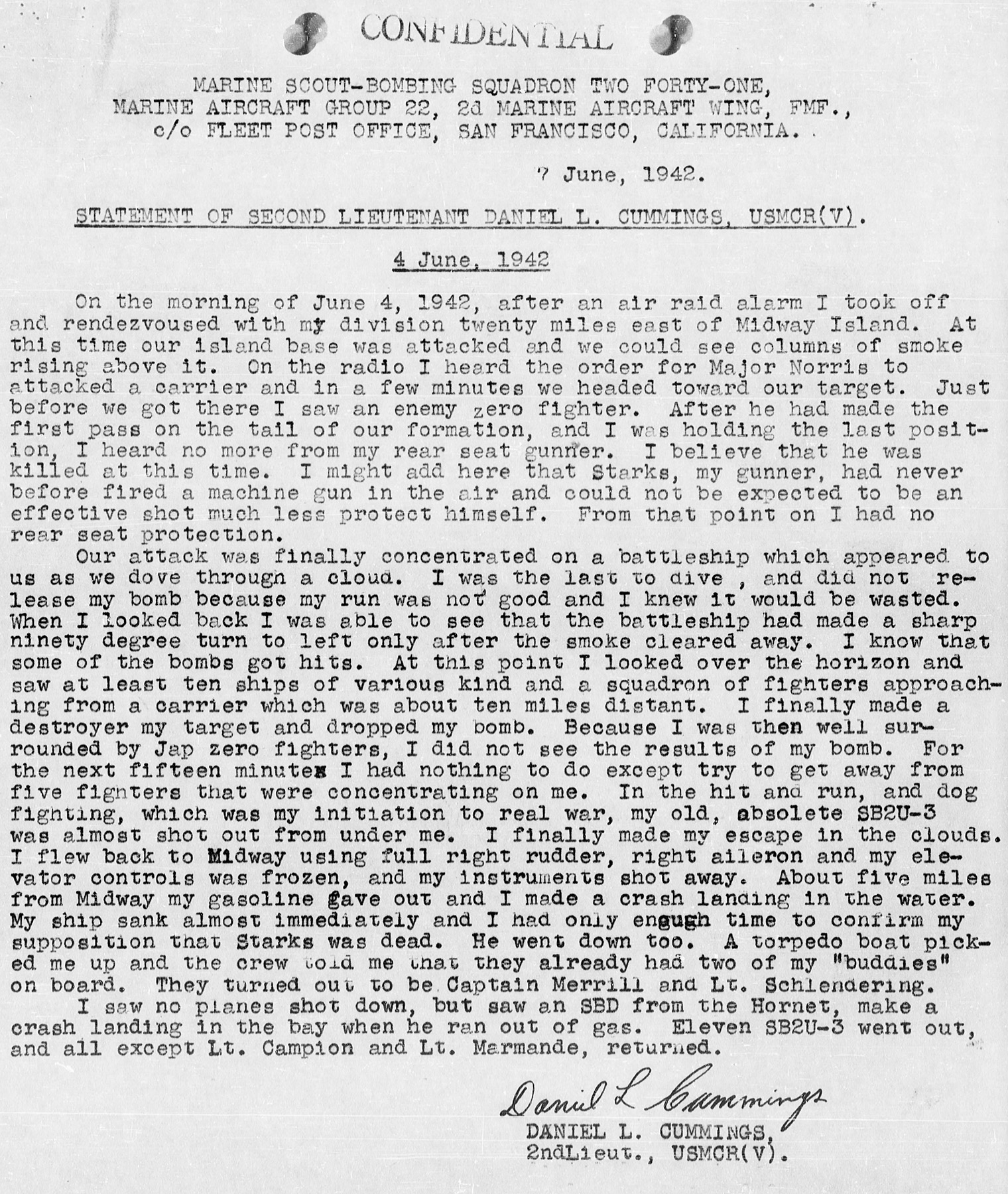 (5) Ibid., Statement of Second Lieutenant Daniel L. Cummings, USMCR. June 7, 1942.