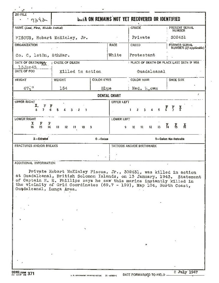 Fiscus was reportedly buried in the field at coordinates (69.7-199) on the standard Map 104 of Guadalcanal’s north coast, not far from the spot where Platoon Sergeant Drain fell. Drain’s grave was found in 1945; he was identified by his dog tags and reburied in the Army-Navy-Marine Corps cemetery. Fiscus was not as fortunate; his burial site has never been located.