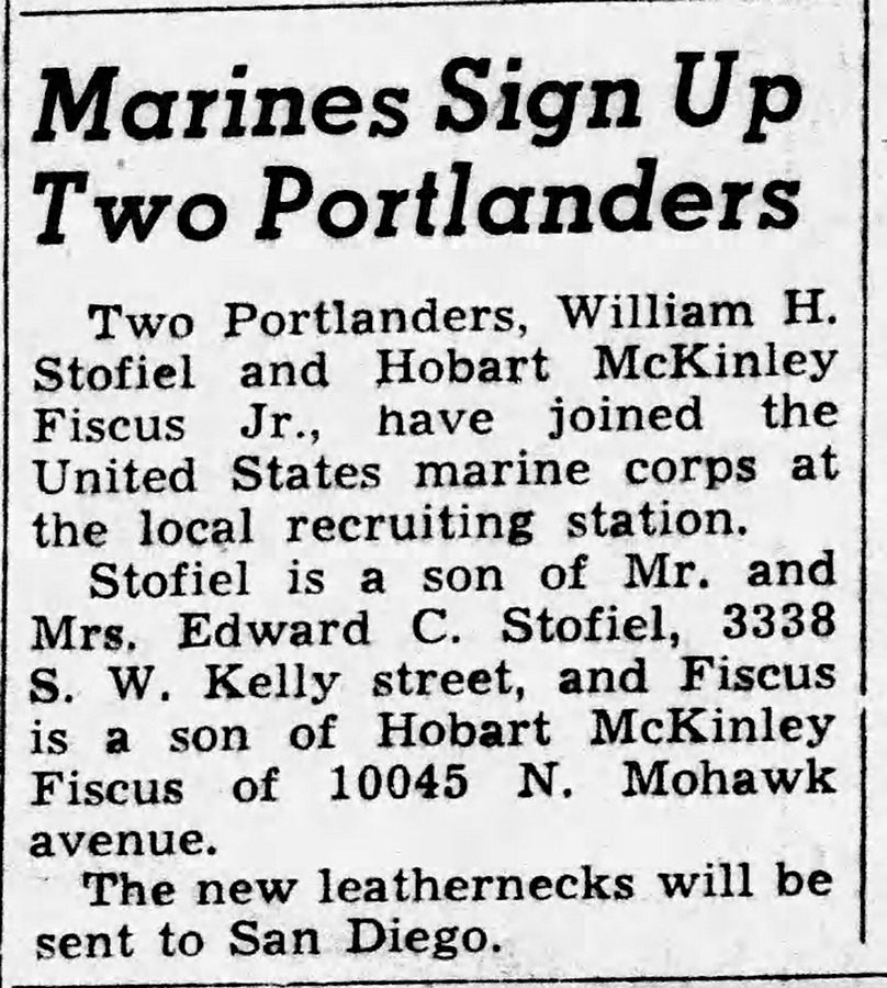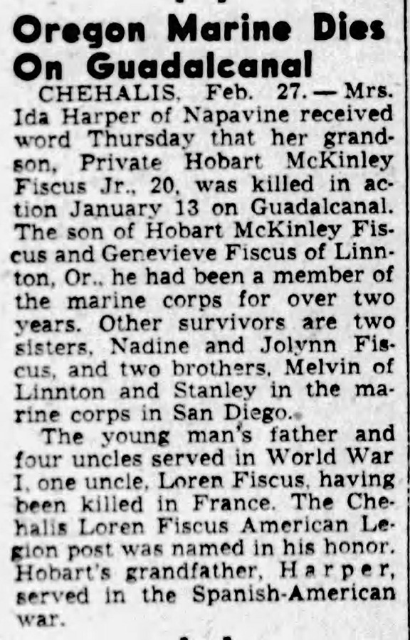 Another son, Stanley J. Fiscus USMC, was killed in action at Saipan on 8 July 1944.
