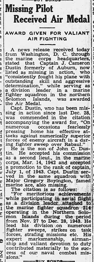 After the mission, Dustin was reported as missing in action and his Corsair (F4U-1 #17908) written off as lost.