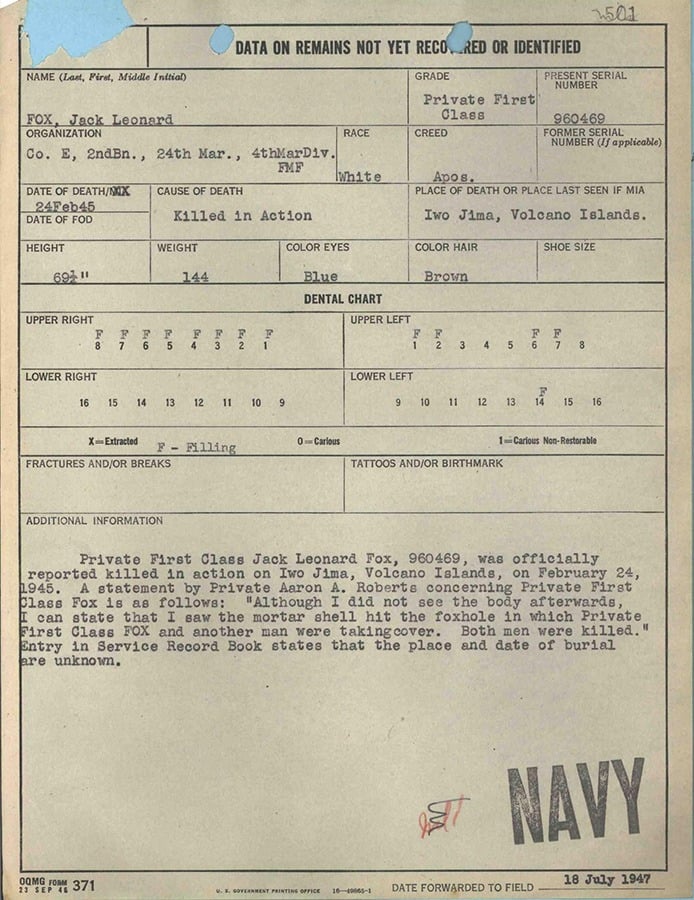 An unidentifiable body was buried in the same row that same day – X-24, in Grave 890. When exhumed for examination in 1948, it was found “most parts of body [were] missing, skull, maxilla, mandible, upper extremities missing,” and the remaining long bones were broken. While these wounds suggest death by high explosives – and the height estimate is within the margin of error for PFC Fox – no dental information or other physical description could be gained from the remains.