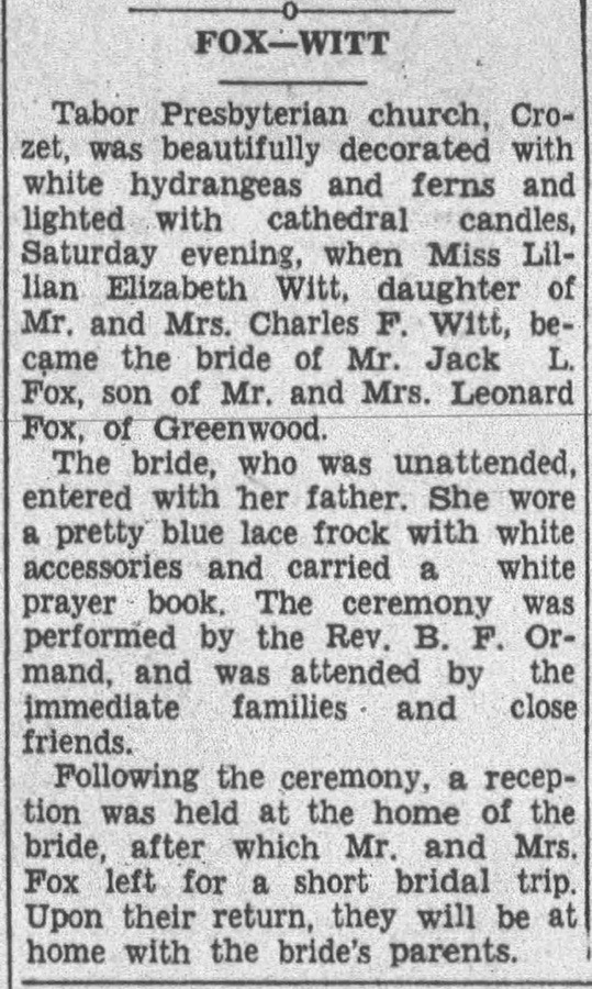 Wife, Mrs. Lillian Elizabeth (Witt) Fox