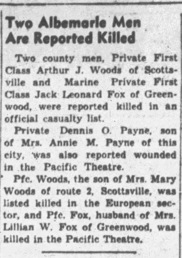 These four Marines were buried close together in the Fourth Marine Division Cemetery on 2 March 1945, in graves 869, 870, 871, and 873, respectively. All were identified at burial, and all suffered shrapnel wounds – making it impossible to know who was killed beside PFC Fox.