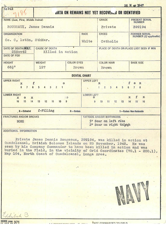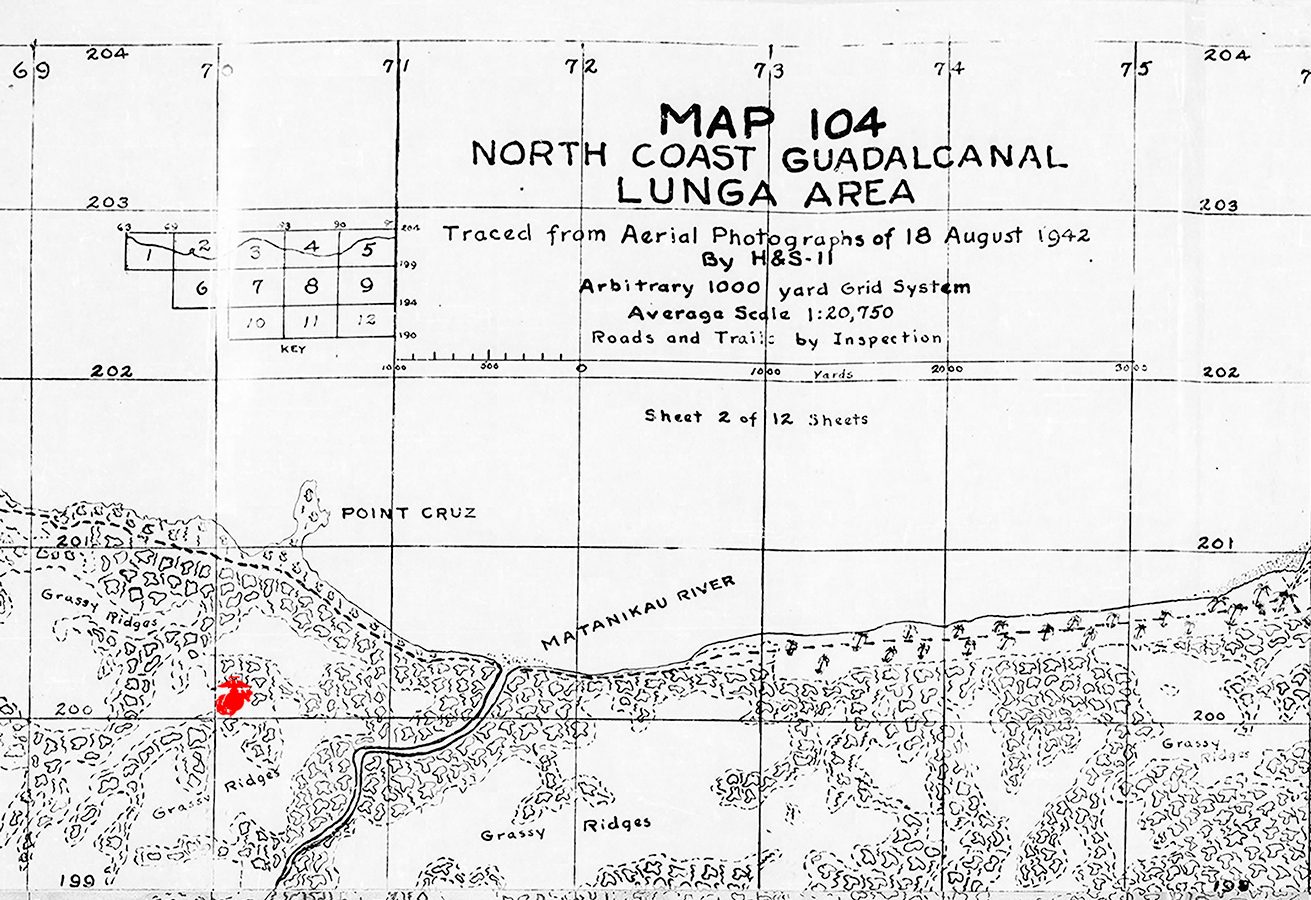 Rougeaux was reportedly buried in the field at coordinates (70.1 – 200.1) on the standard Map 104 of Guadalcanal’s northern coast. Post-war searches reported the location lay “at the end of a narrow grassy ridge. Area is difficult to reach and there have been few if any main changes made since the fighting occurred.” Despite the lack of construction or occupation, Rougeaux’s grave could not be found.